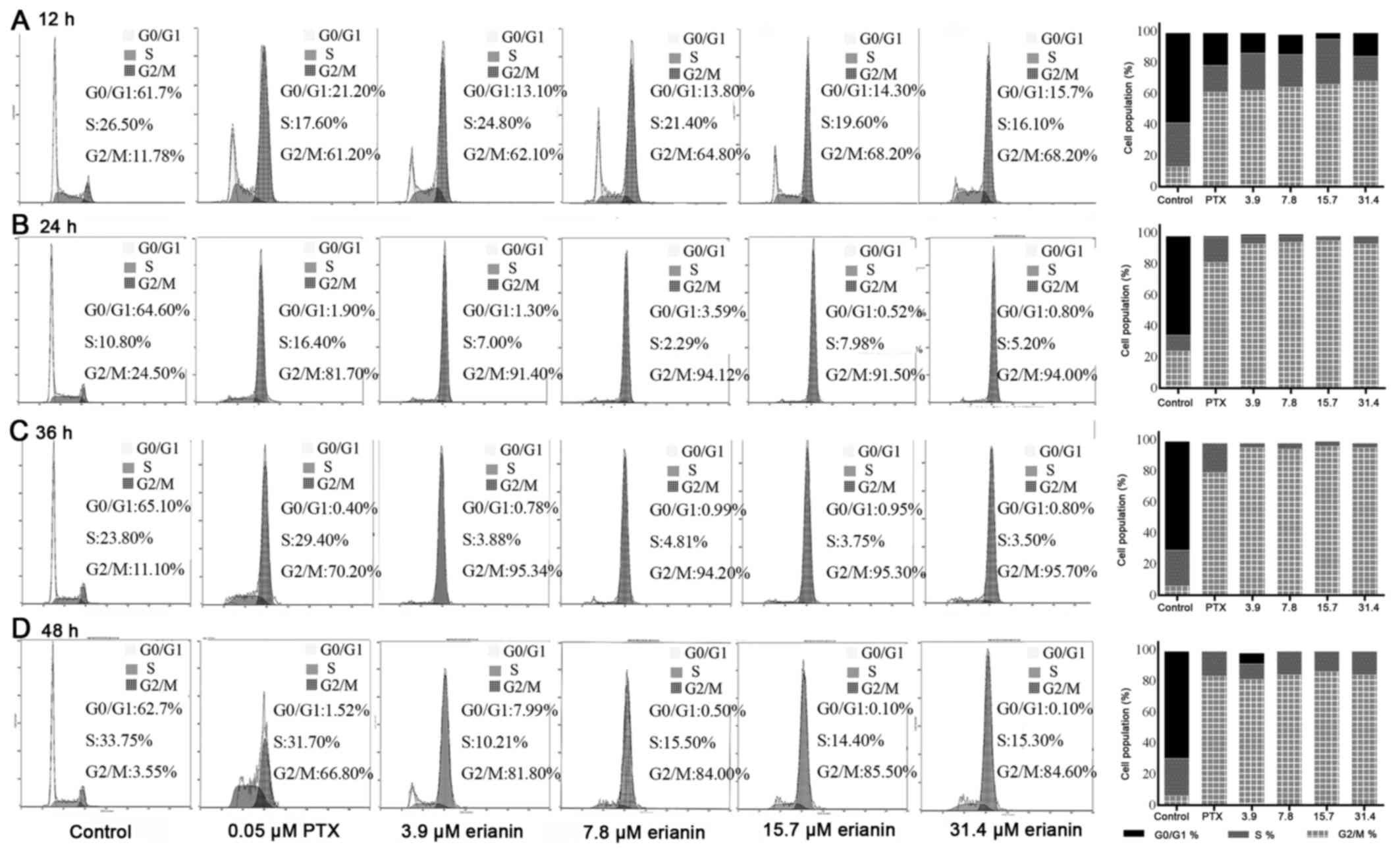 Effects of erianin on cell cycle of HeLa cells. To investigate whether the inhibition in cell proliferation induced by erianin could be attributed to the induction of cell cycle arrest, cell cycle analysis was performed. This analysis revealed that erianin induced cell cycle arrest in a time- and dose-dependent manner (Fig. 3). Compared with the control, the proportion of cells in G0/G1 phase following treatment with erianin and PTX decreased significantly after 12 h of treatment (P<0.01), whereas the proportion of cells in G2/M phase increased significantly (P<0.01) (Fig. 3A), indicating that erianin could at least partly inhibit HeLa cells proliferation via G2/M checkpoint arrest.