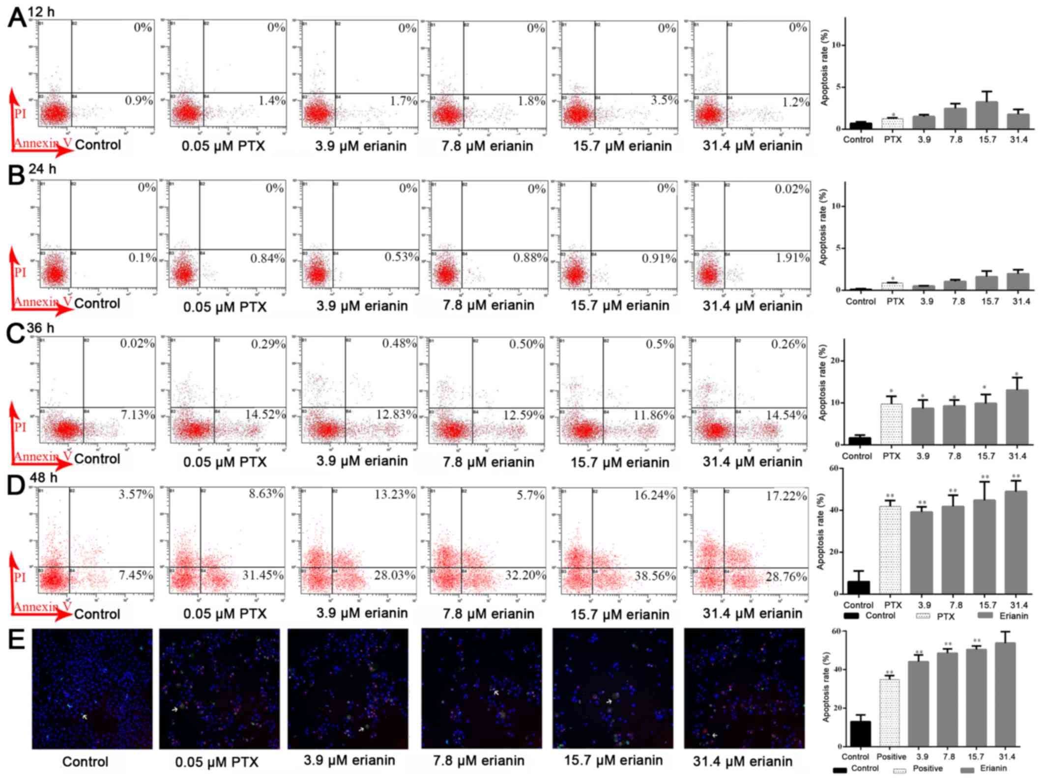 Induction of apoptosis is an central mechanism by which anticancer drugs can inhibit cancer cell growth. Flow cytometry analysis demonstrated that erianin at a dose of 7.8 µM induced apoptosis rate compared with the control, 0.22±0.26 vs. 1.52±0.29% at 12 h, 0.10±0.1 vs. 8.12±0.92% at 24 h, 1.83±0.71 vs. 11.53±1.22% at 36 h and 5.99±5.12 vs. 41.83±5.32% at 48 h, respectively (Fig. 4). As shown in Fig. 4D, erianin could increase rates of early apoptosis in HeLa cells, from 5.99±5.12% in the control (untreated cells at 48 h) to 48.91±5.22% in cells treated with 31.4 µM erianin after 48 h of treatment (P<0.05). Therefore, the results of the present study demonstrated that erianin induced apoptosis in HeLa cells in a time- and dose-dependent manner.