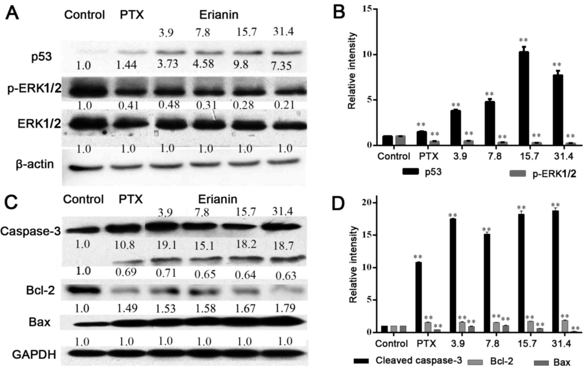Cells were treated with 3.9, 7.8, 15.7 or 31.4 µM erianin or 0.05 µM PTX for 48 h, lysed using lysis buffer radioimmunoprecipitation assay (RIPA; 3 ml; cat. no. AR0102; Wuhan Boster Biological Technology, Ltd., Wuhan, China) buffer with phenylmethane sulfonyl fluoride (40 µl; cat. no. AR1778; Wuhan Boster Biological Technology, Ltd.) and a protease inhibitor cocktail (cat. no. P8340; 30 µl Sigma-Aldrich; Merck KGaA) and the lysates were measured for protein concentrations with a total protein quantitative assay (Coomassie brilliant blue method) kit (cat. no. A405-2; Nanjing Jiancheng Bioengineering Institute, Nanjing, China) as described previously (10), according to the manufacturer's protocols. Protein samples (20 µg) were separated by 10% SDS-PAGE and then transferred to a polyvinylidene fluoride membrane. The membrane was blocked for 2 h with 5% non-fat dry skimmed milk. Following incubation overnight at 4°C with antibodies against tumor protein p53 (hereafter p53) (dilution, 1:1,000; cat. no. ab131442; Abcam, Cambridge, UK), ERK1/2 (dilution, 1:1,000; cat. no. ab50011; Abcam), phosphorylated ERK1/2 (dilution, 1:1,000; cat. no. ab36991; Abcam), caspase-3 (dilution, 1:1,000; cat. no. 9665; Cell Signaling Technology, Inc., Danvers, MA, USA), B-cell lymphoma-2 (Bcl-2) (dilution, 1:1,000; cat. no. ab136285; Abcam), Bcl-2-associated X (Bax) (dilution, 1:1,000; cat. no. ab32503; Abcam), GAPDH (dilution, 1:1,000; cat. no. BA2913; Wuhan Boster Biological Technology, Ltd.) and β-actin (dilution, 1:1,000; cat. no. ab3280, Abcam), the membrane was incubated with horseradish peroxidase-conjugated anti-rabbit antibody (dilution, 1:5,000; cat. no. RA1054; Wuhan Boster Biological Technology, Ltd.) at 37°C for 2 h. Finally, the reaction was visualized using SuperLumia enhanced chimiluminescence kit (cat. no. K22020; Abbkine Scientific Co., Ltd, Wuhan, China) and detected using a Molecular Imager® Gel Doc™ XR+ (Bio-Rad Laboratories, Inc., Hercules, CA, USA). The integrated density of the bands was quantified using Image Lab 5.1 software (Bio-Rad Laboratories, Inc.).