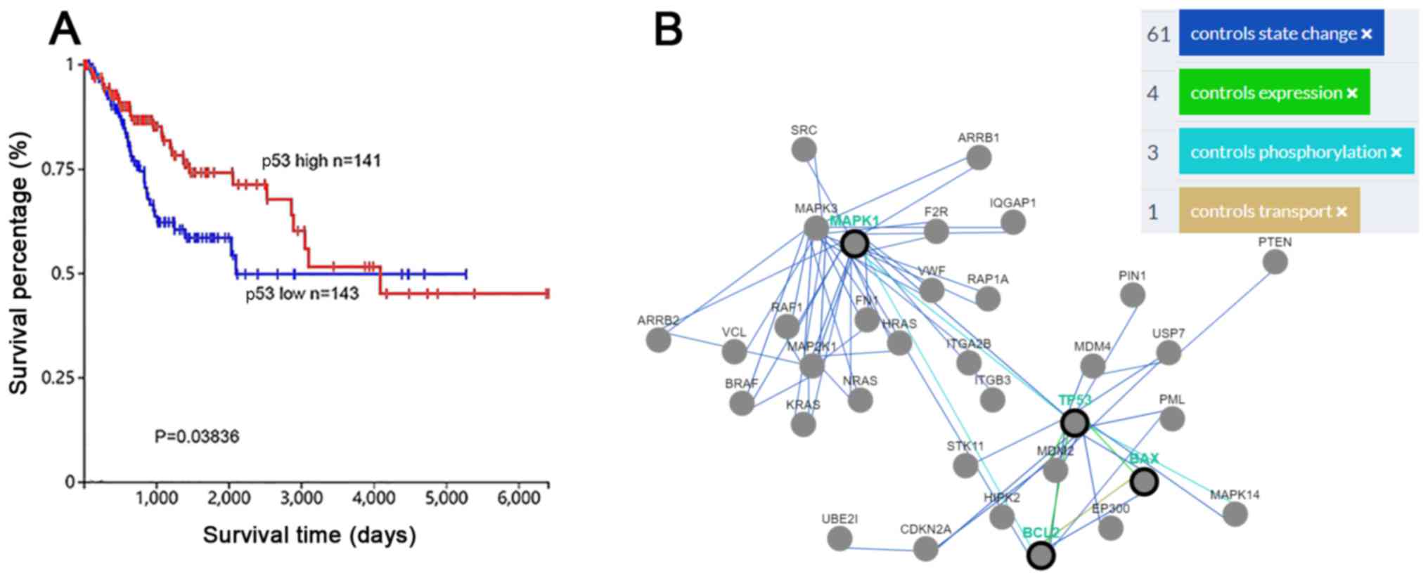The data concerning the association between p53 expression and survival ratios in patients with cervical cancer were acquired from The Cancer Genome Atlas (TCGA) database (https://cancergenome.nih.gov/). The interaction regulatory function of p53, ERK1/2, Bax and Bcl-2 was analyzed using Pathway Commons (http://www.pathwaycommons.org/) (11).