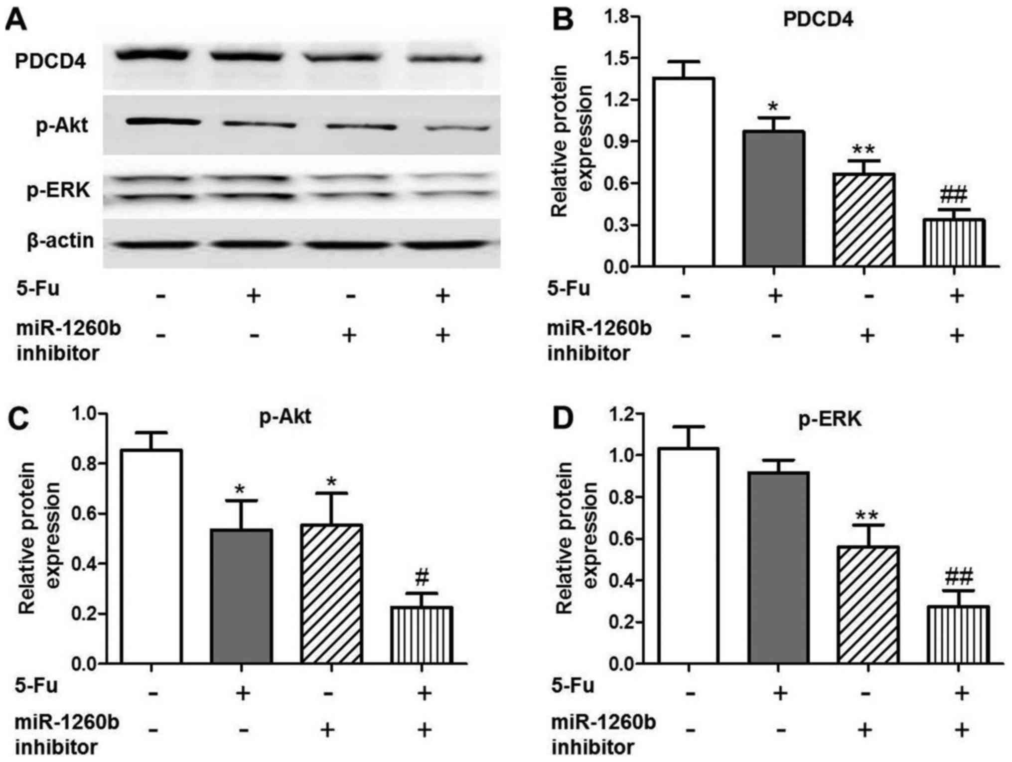 Following treatment with miR1260b inhibitor with or without 5-FU for 48 h, HCT116 cells were collected. The cells were lysed in radioimmunoprecipitation assay buffer (Sigma-Aldrich; Merck KGaA). Protein concentration was quantified using a BCA Protein Assay kit (Beyotime Institute of Biotechnology). Total protein (30 µg) from each group was loaded and resolved by 10% Tris-SDS-PAGE. Following electrophoresis, the gel was electro-transferred to polyvinylidene fluoride membranes (Thermo Fisher Scientific, Inc.). The following blocking and antibody incubations were performed according to the iBind kit (Thermo Fisher Scientific, Inc.) manufacturer's protocol. Briefly, primary antibodies were incubated at room temperature for overnight. Following 3 times washing with iBind™ Flex/iBind™ Flex FD solution (Cat#SLF2020, Thermo Fisher Scientific, Inc.), the secondary antibodies were used to incubate the membranes at room temperature for 4 h. The primary antibodies were as follows: Anti-p-Akt (cat# 4060, dilution, 1:300; Cell Signalling Technology, Inc., Danvers, MA, USA), anti-PDCD4 (cat# 9535, dilution, 1:300; Cell Signaling Technology, Inc.) anti-phosphorylated-extracellular-signal-regulated kinase (p-ERK). (cat# sc-81492, dilution, 1:1,000; Santa Cruz Biotechnology, Inc., Dallas, TX, USA) and anti-β-actin (cat# 58673, dilution, 1:1,000; Santa Cruz Biotechnology, Inc.). Horseradish peroxidase-conjugated IgG secondary antibodies were purchased from Santa Cruz Biotechnology with the dilution of 1:3,000 and the detail information of secondary antibodies as following: Anti-rabbit (cat# sc-2004), anti-mouse (cat# sc-2005) and anti-goat (cat# sc-2020). The signals were detected with SuperSigal® west femto maximum sensitivity substrate (Thermo Fisher Scientific, Inc), and the specific protein bands were captured with Bio-Rad Lab™ 2.0 software (Bio-Rad Laboratories, Inc.).