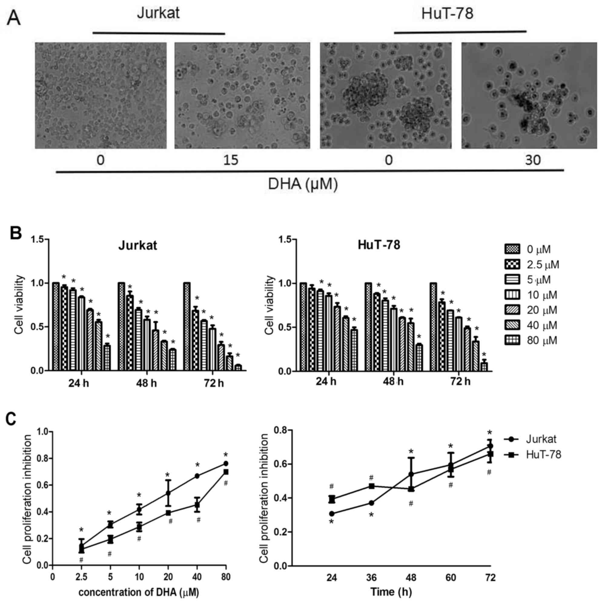 Cell viability assay was evaluated using Cell Counting kit-8 (CCK-8; Anhui Yiyuan Biotechnology Co., Ltd., Anhui, China). Jurkat cells were seeded at a density of 8×103 cells/well in 100 µl RPMI-1640 medium supplemented with 10% fetal bovine serum and HuT-78 cells were seeded at a density of 8×103 cells/well in 100 µl Iscove's modified Dulbecco's medium containing 20% fetal bovine serum in a 96-well plate (Costar; Corning Incorporated, Corning, NY, USA), and the cells were incubated for 24, 36, 48, 60 or 72 h with DHA (0, 5, 10, 20, 40 or 80 µM) added to the culture medium. At each time point, 10 µl CCK-8 was added to each well and the cells were subsequently incubated at 37°C for 2 h. Absorbance was detected at 450 nm on a microplate absorbance reader (Sunrise; Tecan Group Ltd., Männedorf, Switzerland).