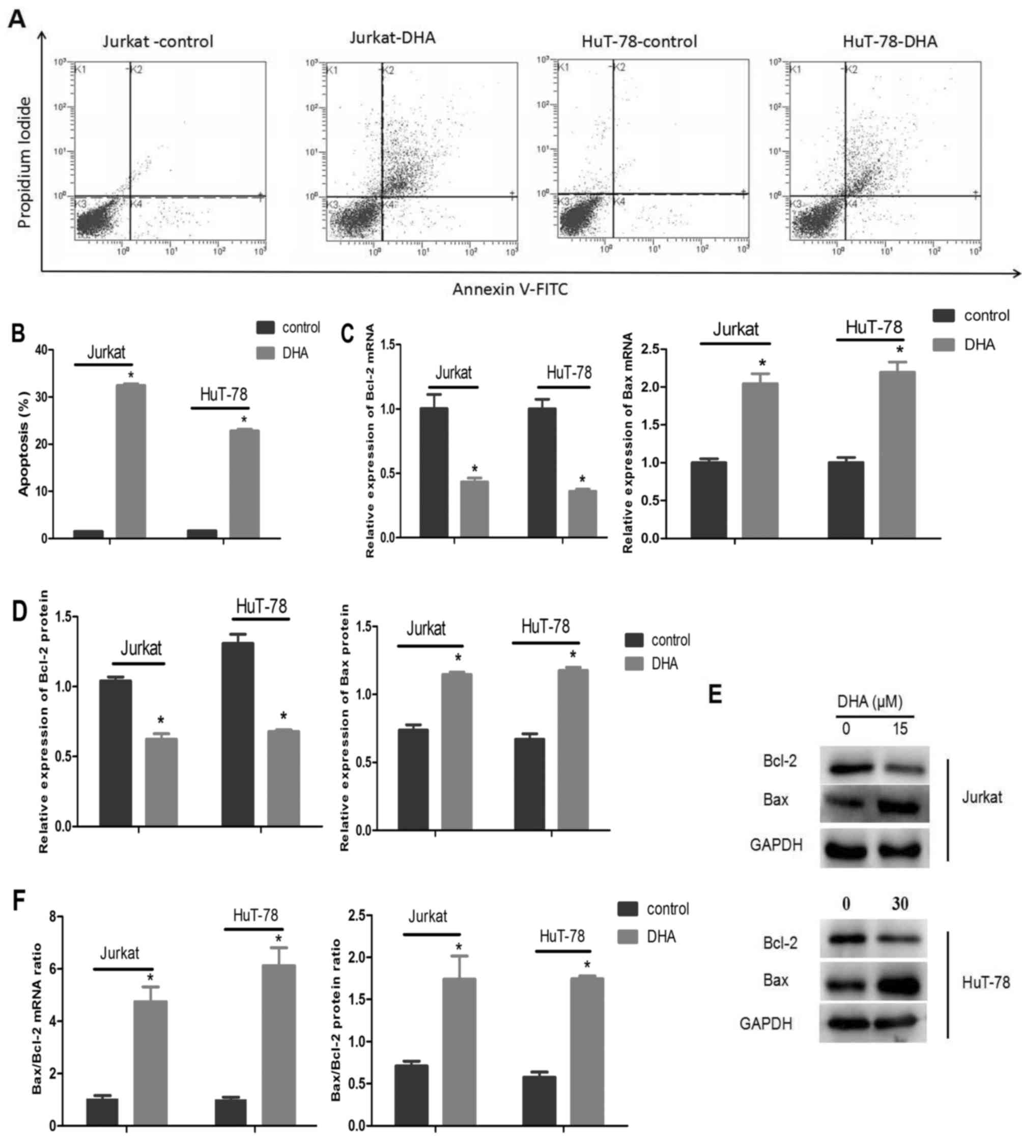 The mRNA and protein expression levels of Bax and Bcl-2 were also evaluated by RT-qPCR and western blot analysis. In the two cell lines, Bax mRNA and protein expression was increased while Bcl-2 mRNA and protein expression was significantly decreased following exposure to DHA compared with the control group (Fig. 2C-E). In Jurkat cells, DHA induced a 4.72-fold increase in the ratio of Bax/Bcl-2 mRNA compared with the control group and increased the ratio of Bax/Bcl-2 protein expression by over 2-fold. In HuT-78 cells treated with DHA, the ratio of Bax/Bcl-2 mRNA and protein expression increased by 6.08-fold and 3.39-fold, respectively, compared with the control group (Fig. 2F).