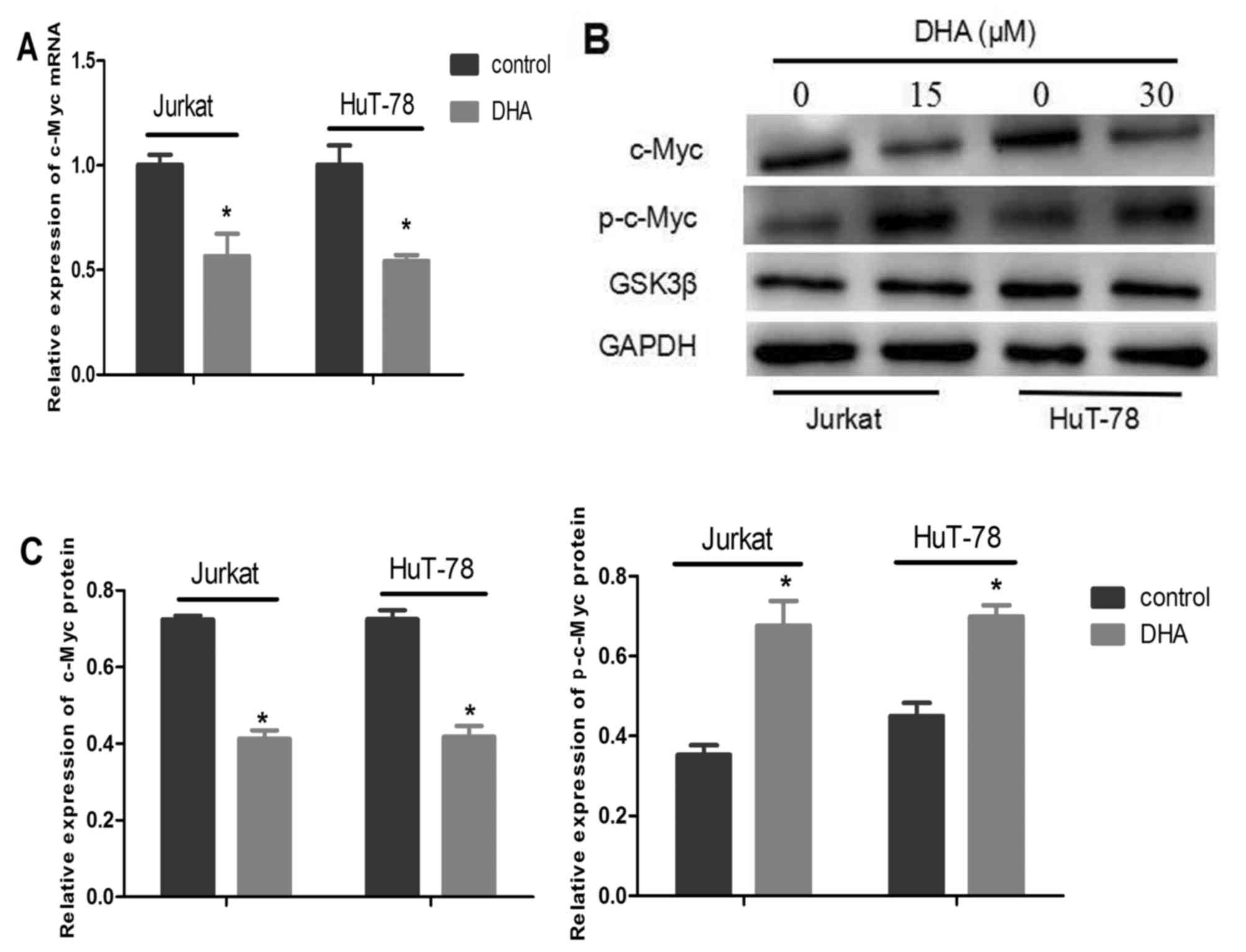 In conclusion, the results of the present study suggested that DHA decreased c-Myc protein expression levels at the transcriptional level and triggered c-Myc degradation by enhancing the phosphorylation of c-Myc at threonine 58 to inhibit cell proliferation and increase cell apoptosis. Furthermore, DHA blocked cell proliferation by suppressing the Akt/GSK3β signaling pathway and reducing c-Myc protein expression, and DHA also induced apoptosis by increasing the ratio of Bax/Bcl-2 in T-cell lymphoma cells. The results of the present study aid in clarifying the mechanism of DHA antitumor activity in T-cell lymphoma cells.
