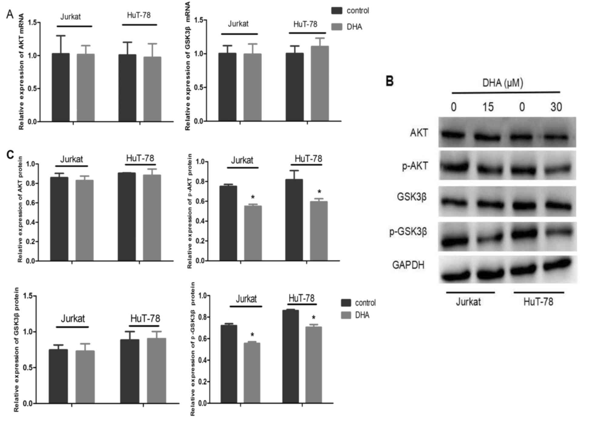 Based on these studies, we hypothesized that DHA exhibits antiproliferation activity in T-cell lymphoma cells and that DHA may mediate c-Myc oncoprotein degradation and downregulate the Akt/GSK3β signaling pathway in T-cell lymphoma cells. Therefore, the present study examined the potential anticancer effect of DHA on T-cell lymphoma cells (Jurkat and HuT-78 cells). We also investigated the underlying mechanism of DHA was also investigated in T-cell lymphoma cells and the potential involvement of the AKT/GSK3β signaling pathway. This study may provide evidence for DHA as a possible treatment for T-cell lymphoma cells.