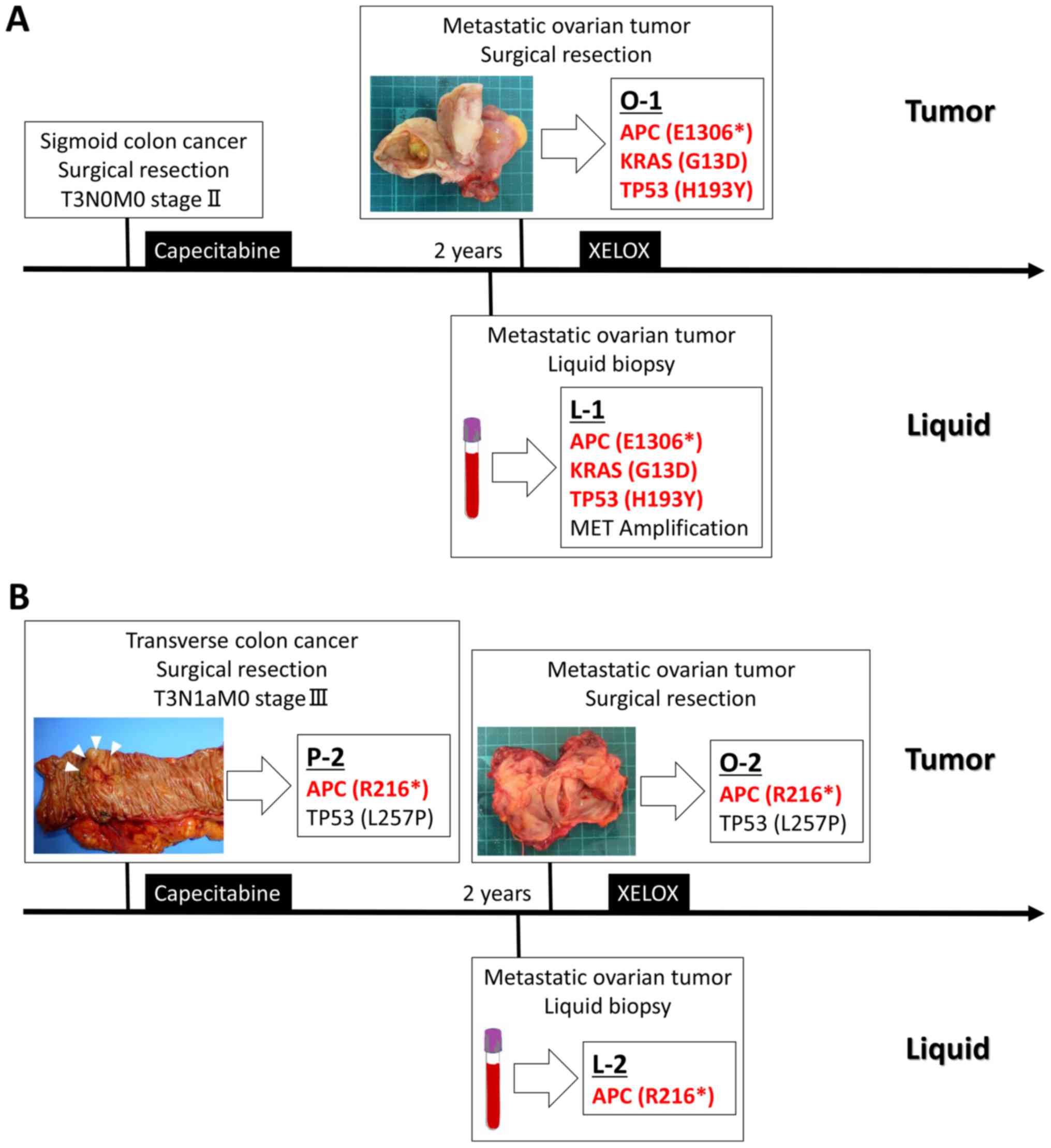 A 61-year-old female was referred to our institution with suspected ovarian cancer. She had been diagnosed with sigmoid colon cancer 2 years ago, which was completely surgically resected in other institution. The tumor had a moderately differentiated histology, and pathologically, it extended into the subserosa (pT3). There were no lymph node or distant metastases (pN0, M0). The patient received adjuvant chemotherapy (8 courses of capecitabine). Two years later, a tumor appeared in the right ovary. Magnetic resonance imaging (MRI) revealed a solid 4.3-cm mass with an irregular surface, and positron emission tomography-computed tomography (PET-CT) detected high radiotracer uptake by the tumor [maximum standardized uptake value (SUVmax): 10.66]. The patient's levels of carcinoembryonic antigen (CEA) and cancer antigen (CA) 19-9 were elevated (to 8.8 ng/ml and 58.4 U/ml, respectively), whereas her CA125 level was normal. The patient underwent a total abdominal hysterectomy and bilateral salpingo-oophorectomy, and the pathological diagnosis was metastatic ovarian cancer. We obtained an FFPE sample from the metastatic ovarian tumor (O-1) and a preoperative plasma ctDNA sample (L-1). The patient's clinical course and clinicopathological features are summarized in Fig. 1A. Targeted re-sequencing was performed using the QIAseq Human Comprehensive Cancer Panel for O-1 and the AVENIO ctDNA surveillance kit for L-1. Intronic changes and exonic SNP listed in the HGVD database were excluded from our analysis, as described in Materials and Methods. Non-synonymous somatic point mutations that resulted in changes in protein amino acid sequences are summarized in Table I. In O-1, mutations were identified in three regions, the KRAS G13D, adenomatous polyposis coli (APC) E1306*, and tumor protein p53 (TP53) H193Y genes. Sequencing of the plasma ctDNA detected three mutations and one copy number variation; i.e., KRAS G13D, APC E1306*, and TP53 H193Y mutations and MET gene amplification. A comparison of the genetic profiles of O-1 and L-1 revealed that the KRAS G13D, APC E1306*, and TP53 H193Y gene mutations, which are well-known genetic signatures of colorectal cancer were present in both O-1 and L-1. These results suggest that liquid biopsy-based gene mutation profiling could facilitate the preoperative diagnosis of metastatic colorectal cancer to the ovary. The patient received postoperative adjuvant chemotherapy (8 courses of capecitabine and oxaliplatin; XELOX).