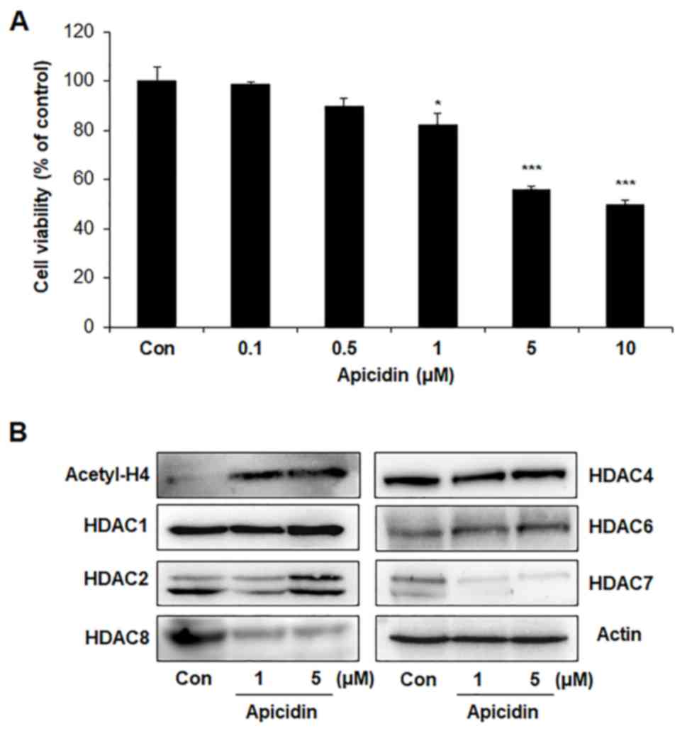In order to analyze the effects of apicidin on cell viability, AT-84 cells were treated with increasing concentrations of apicidin and the cell viability was assessed with an MTT assay. Apicidin inhibited the viability of AT-84 cells in a dose-dependent manner, whereby concentrations of ≥1 µM resulted in a significant reduction (Fig. 1A). Subsequently, the effect of apicidin on the levels of histone acetylation and specific HDACs was analyzed using western blotting. The cells were treated with the indicated concentrations of apicidin (1 and 5 µM) for 24 h. As depicted in Fig. 1B, apicidin treatment notably increased the level of acetylated histone H4 and decreased the level of HDAC8 in AT-84 cells. HDAC7 expression was also marginally reduced, but there was no change in the expression of other HDACs in apicidin-treated AT-84 cells. These results indicated that apicidin induces cell growth inhibition and that it primarily inhibited HDAC8 expression in AT-84 cells.
