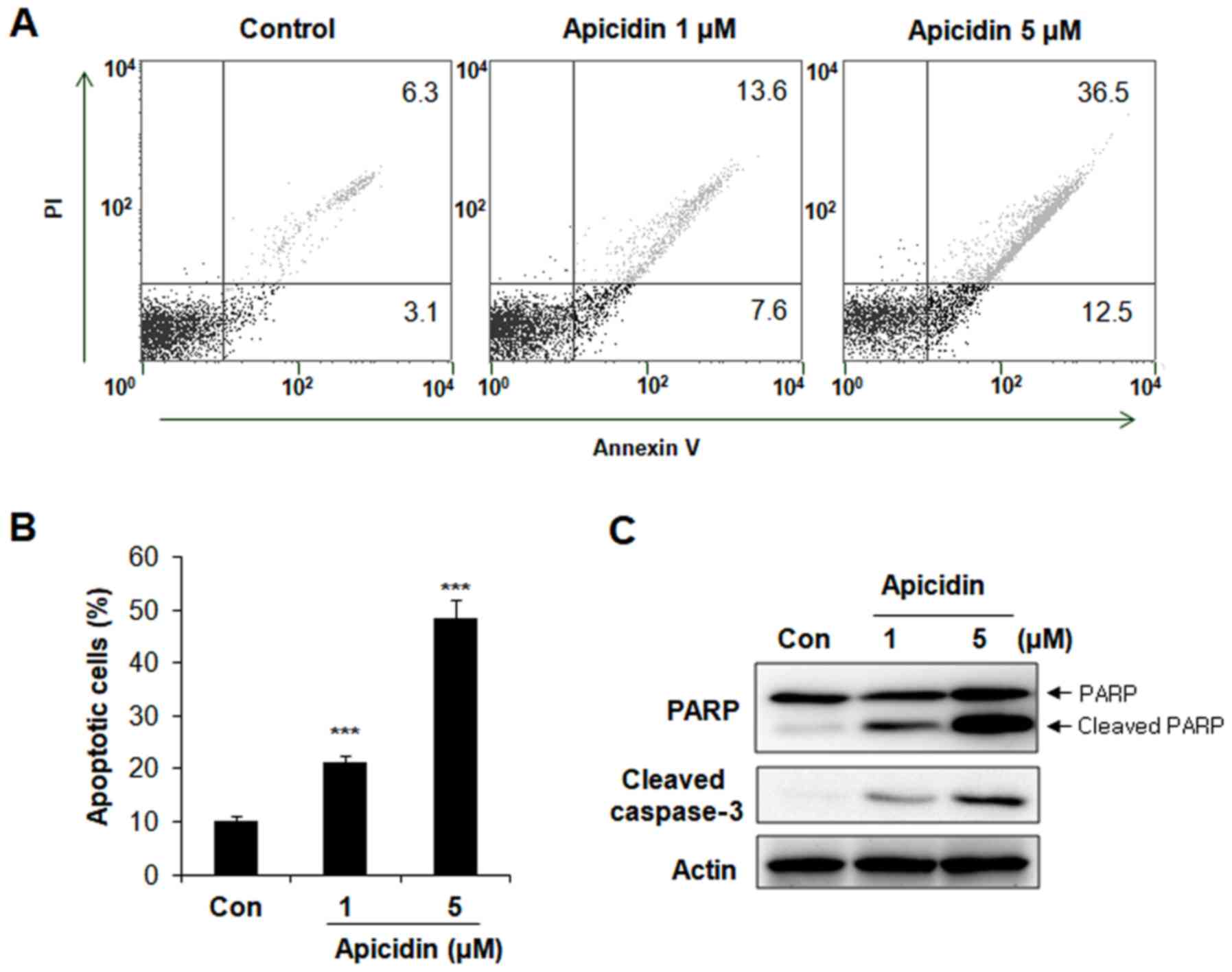 To elucidate the mechanism underlying the reduction in viability of AT-84 cells following treatment with apicidin, apoptosis was measured with an Annexin V apoptosis assay. AT-84 cells were treated with 1 and 5 µM apicidin for 24 h, and Annexin-V/PI double staining was examined with flow cytometry. Apicidin significantly increased the percentage of Annexin V-positive apoptotic cells in a dose-dependent manner compared with the untreated control group (Fig. 2A and B). The ratio of Annexin V-positive cells was 21 and 49% at doses of 1 and 5 µM apicidin, respectively compared with 6.3% in the control group. The expression of apoptosis-associated protein levels was measured with western blot analysis to confirm apoptosis involvement. As depicted in Fig. 2C, a concentration-dependent increase in cleaved PARP and cleaved caspase-3 expression levels were observed in apicidin-treated AT-84 cells, whereas levels of total PARP remained constant. These results indicated that apicidin induced caspase-dependent apoptosis in AT-84 cells.