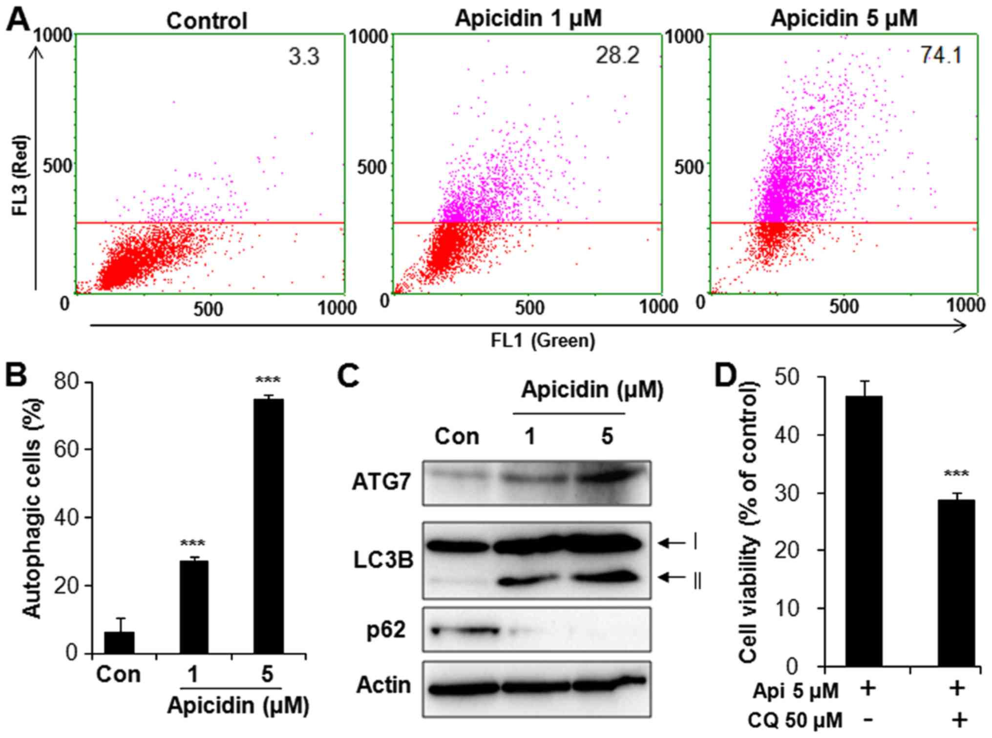 To determine whether apicidin induces autophagy in AT-84 cells, acridine orange staining was performed and evaluated with flow cytometry. As depicted in Fig. 3A, red fluorescence intensity in flow cytometric analysis was dose-dependently increased with apicidin treatment in AT-84 cells, indicating an enhancement of AVOs. The ratio of red fluorescence intensity was 24 and 78% at doses of 1 and 5 µM apicidin, respectively, both of which was significantly increased compared with the untreated control group (Fig. 3B). Autophagy-associated protein expression was measured using western blotting to confirm the induction of autophagy. Apicidin notably induced the expression level of ATG7 and LC3B-II, a specific marker of autophagosome promotion (Fig. 3C). The level of p62, a marker for autophagic flux, was decreased in apicidin-treated AT-84 cells. Additionally, to determine whether autophagy by apicidin contributes to survival or death, AT-84 cells were co-treated with apicidin and CQ, a specific autophagy inhibitor. Cell viability was examined using the trypan blue exclusion assay. As depicted in Fig. 3D, apicidin with CQ treatment significantly reduced cell viability, compared with apicidin without CQ. These results demonstrated that apicidin induced autophagy in AT-84 cells and that autophagy induction by apicidin may be associated with cell protection.