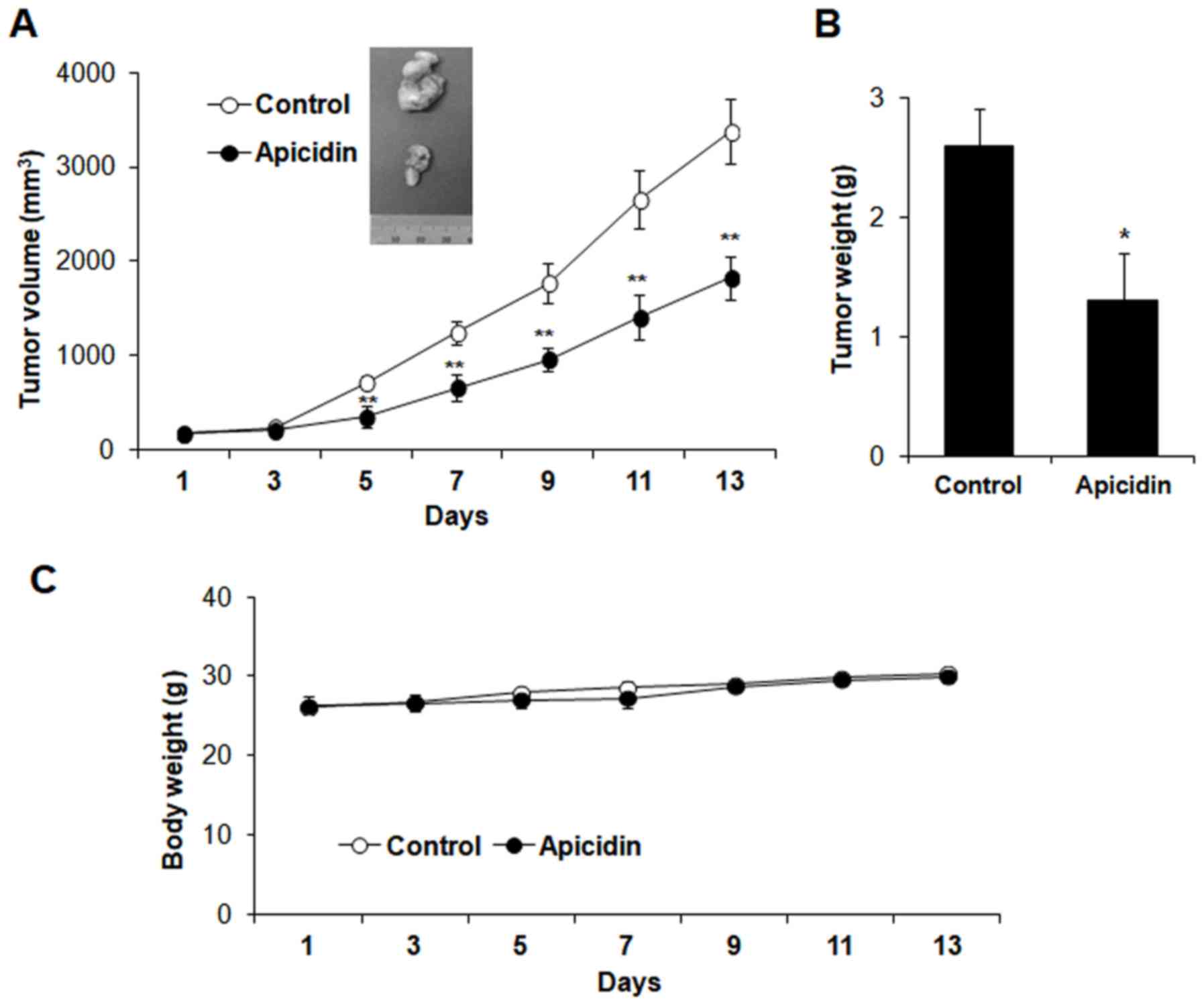 The in vivo effect of apicidin on tumor growth was examined using mice inoculated with AT-84 cells. These mice were administered with apicidin or vehicle every other day for a 14-day period. As depicted in Fig. 4A, apicidin significantly decreased the tumor volume, compared with the control group, and inhibited tumor growth up to 47% relative to the control group at the end of the 14-day period. Mean tumor weight was also significantly reduced in the apicidin-treated group, compared with the vehicle-treated control group (Fig. 4B). No significant systemic toxicity, including body weight changes or other apparent adverse effects, was observed in the animals throughout the study period (Fig. 4C). These results indicated that apicidin exhibited an antitumor effect against AT-84 cells in vivo.
