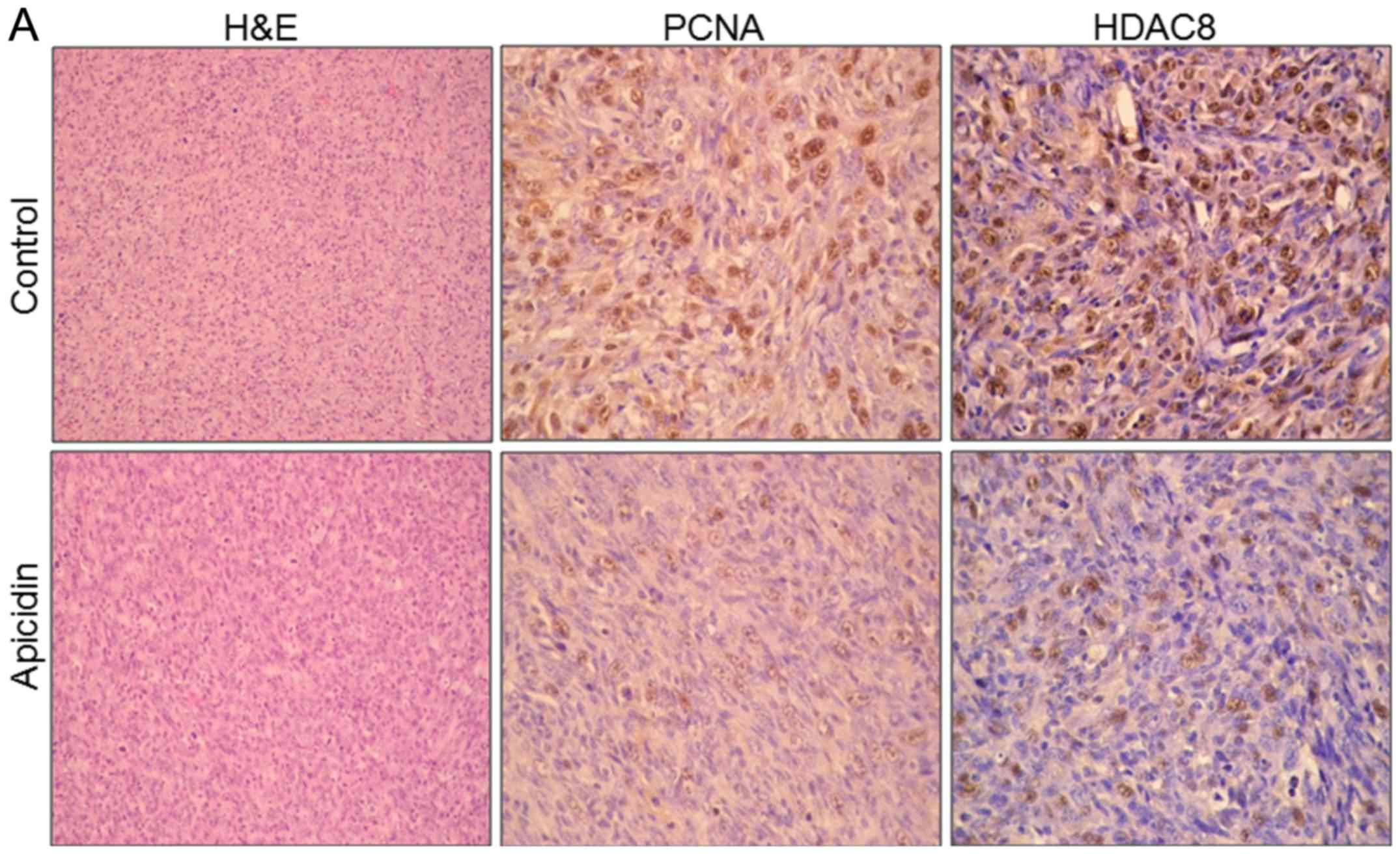 The histological changes between apicidin-treated and control groups were examined using hematoxylin and eosin staining in paraffin-embedded tumor sections. Markedly increased eosinophilic cytoplasm and nuclear changes were observed in tumor tissues treated with apicidin, compared with the control tumor tissues (Fig. 5). Subsequently, the immunohistochemistry was examined with regard to the antitumor effects of apicidin in tumor tissues. As depicted in Fig. 5A and C, tumor tissues treated with apicidin exhibited significantly decreased PCNA and HDAC8 expression levels, compared with control tumor tissues treated with vehicle. Furthermore, the percentage of TUNEL-positive apoptotic cells was significantly increased, with a significant increase in LC3B and reduction in p62 expression levels in apicidin-treated tumor tissues, compared with vehicle-treated control tumor tissues (Fig. 5B and C). These results demonstrated that apicidin effectively inhibited cell proliferation and HDAC8, and induced apoptosis and autophagy in vivo AT-84 mediated OSCC model.