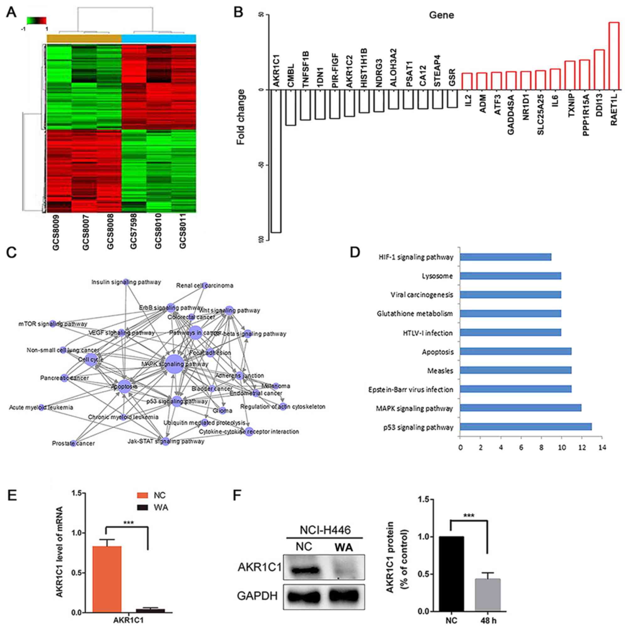 Bioinformatics analyses demonstrated that AKR1C1 may be a target gene of WA. According to the results of bioinformatics analysis, there are 17,873 differentially expressed genes during the progression of WA-mediated NCI-H446 cells. The association of expression profiles between the two groups was demonstrated by unsupervised hierarchical clustering analysis tree (Fig. 3A). The logarithm of the fluorescence intensity ratio was represented by fold change, and a log2 ratio≥1.0 or a log2 ratios≤-1.0 means a two-fold change (Fig. 3B). These data indicated WA upregulated 10,560 genes and downregulated 7,313 genes. The AKR1C1 gene underwent the most significant change following WA treatment (P<0.001) (Fig. 3B). Pathway analysis demonstrated that the differentially expressed genes were mainly involved in 159 KEGG classical pathways, particularly in the p53 signaling pathway (23 genes), mitogen-activated protein kinase signaling pathway (44 genes), apoptosis (23 genes), PI3K-AKT signaling pathway (40 genes), nuclear factor-κB signaling pathway (17 genes), Janus kinase-signal transducer and activator of transcription signaling pathway (15 genes), vascular endothelial growth factor signaling pathway (16 genes) and insulin signaling pathway (18 genes; Fig. 3D). RT-qPCR analysis indicated that the mRNA expression level of gene AKR1C1 was notably decreased in the WA treatment NCI-H446 cells (Fig. 3E). Additionally, western blot analysis demonstrated that the protein expression level of AKR1C1 was notably decreased in the WA treatment NCI-H446 cells (Fig. 3F).