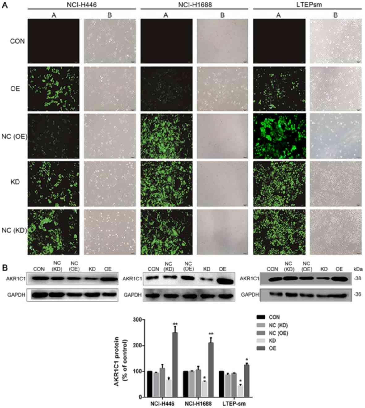 NCI-H446, NCI-H1688 and LTEP-sm cells were respectively transfected with AKR1C1 expressing vector (OE group), shRNA vector specific for AKR1C1 (KD group) and control green fluorescent protein (GFP) vectors (NC group). The negative control vector contained a GFP marker for cell tracking. The AKR1C1 expressing vector (pLenti-EF1α-GFP-puromycin-AKR1C1-Amp cDNA expression lentiviral vector) contained a green fluorescent protein marker. The shRNA vector specific for AKR1C1 vector was pGLV-H1-GFP-puromycin-shRNA-AKR1C1 vector. All were purchased from Shanghai GenePharma Co., Ltd. (Shanghai, China). Empty lentiviral vector was used as control. To further investigate the biological significance of the AKR1C1 gene in SCLC cells, NCI-H446, NCI-H1688 and LTEP-sm cells were transfected with AKR1C1 gene retroviral vector plasmid (OE group) or lentiviral vector carrying sh-AKR1C1 plasmid (KD group). Following 48 h transfection, fluorescence microscopy (×200) demonstrated the observed transfection efficiency. Following 72 h infection, the efficiency was validated by western blot analysis.