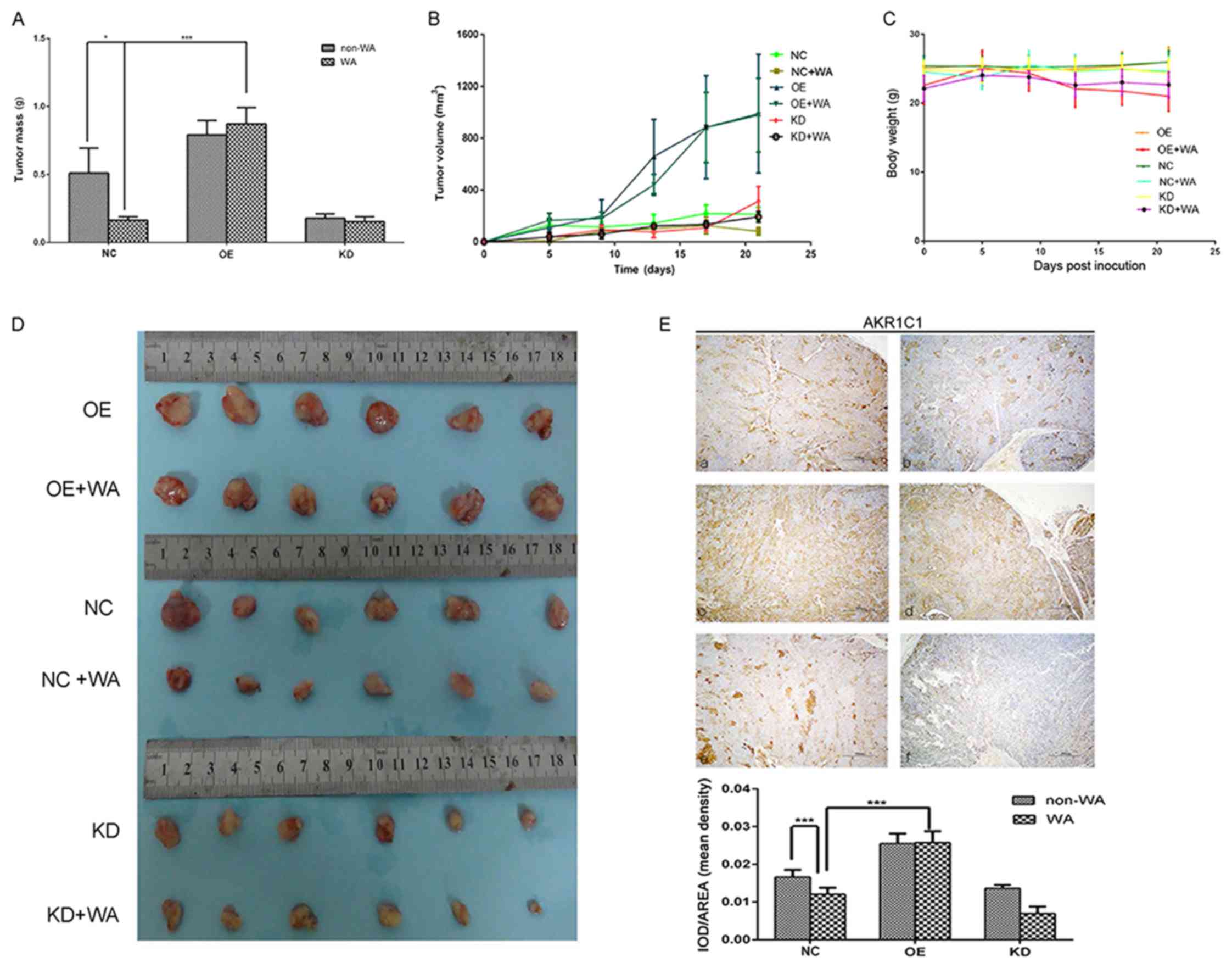 To further confirm the growth-attenuating effect of WA and the growth-promotion effect of AKR1C1 on SCLC cells, a xenograft tumor growth assay was performed. Following 20 days, the tumors were harvested. The total weight of the WA treatment tumors was significantly lower in nude mice, compared with the control mice (P<0.05, Fig. 6A). The subcutaneous tumor volume growth curve of NCI-H446 stably expressed in vivo was depicted in Fig. 6B. The tumor volume was significantly larger in the OE group nude mice, compared with the NC group mice at 5, 10, 15 and 20 days (P<0.05, Fig. 6B); however, the tumor volume was reduced following WA treatment. Compared with the NC group, there was no significant weight loss observed in the WA treatment group animals (P>0.05) (Fig. 6C). Immunohistochemistry of AKR1C1 antigen was detected, and results demonstrated expression of AKR1C1 was lower in the WA treatment group (Fig. 6E). The results revealed that WA could attenuate the expression of AKR1C1 and the proliferation of SCLC in vivo. These results provide further evidence that WA serves a tumor-attenuated role in SCLC.