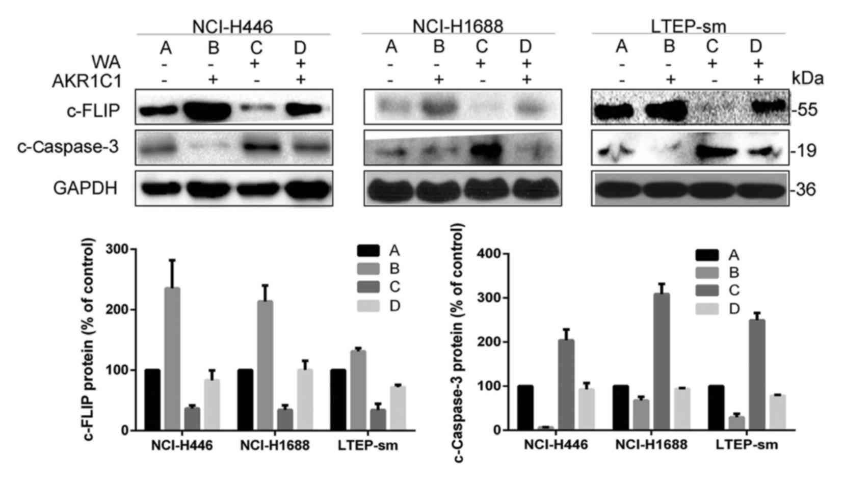 In the present study, it was demonstrated that overexpression of AKR1C1 gene promoted the expression of c-FLIP, whilst WA treatment inhibited the expression of the c-FLIP protein, activated c-Caspase-3 and induced apoptosis in SCLC cell lines (Fig. 7). Palackal et al (16) demonstrated that in patients with SCLC, differential display demonstrated that AKR1C transcripts are notably overexpressed. Wang et al (17) indicated that the downregulation of c-FLIP drove lung cancer cells into cellular apoptosis. c-FLIP had been demonstrated to induce apoptosis thus increasing Caspase-8 and then Caspase-3 activation (18).