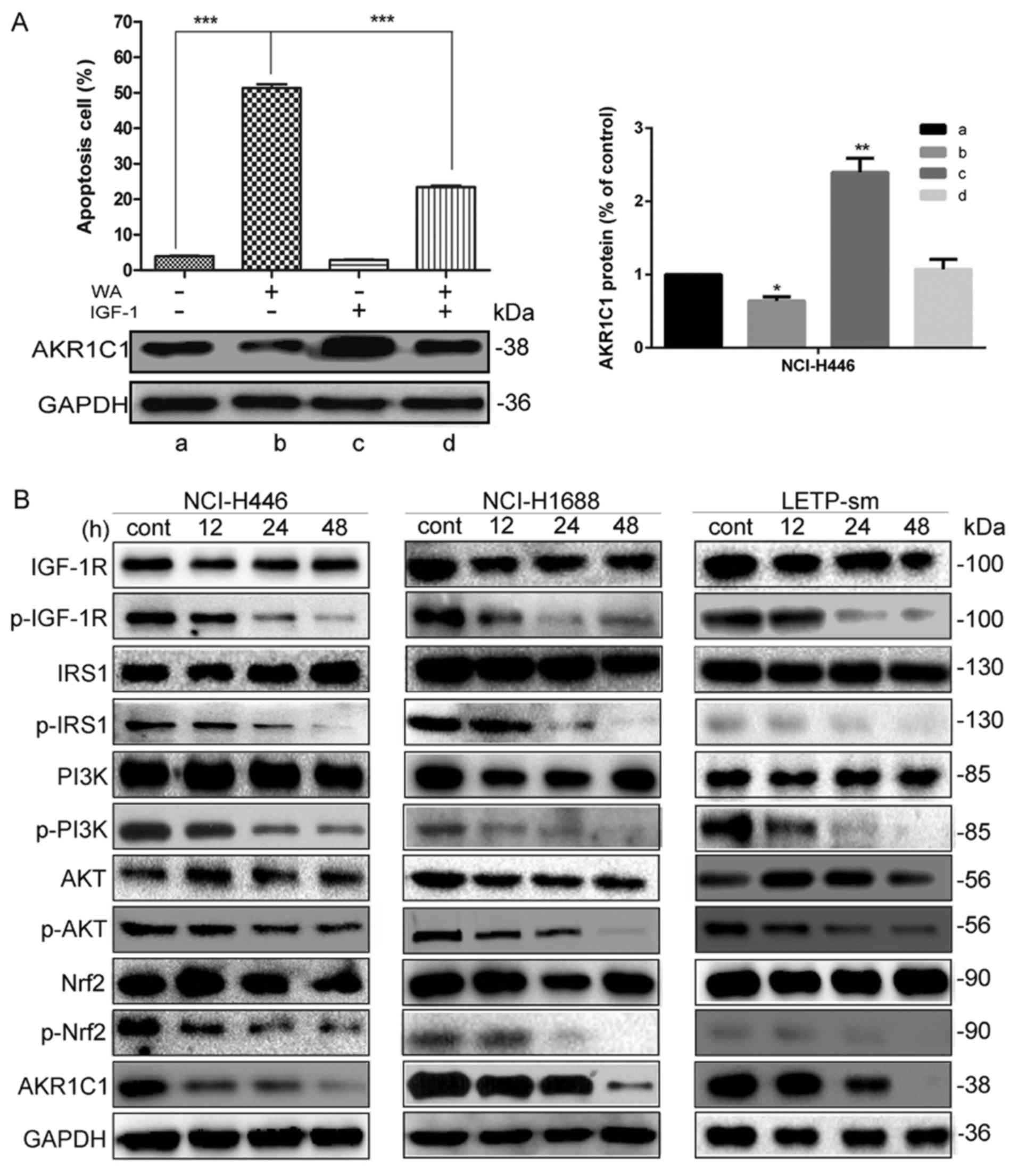 Apoptosis of SCLC cells were investigated by flow cytometry prior to and following WA treatment. Flow cytometry assay and western blot analysis both confirmed WA inhibited the expression of AKR1C1 via the IGF-1R/IRS-1/PI3K/AKT/Nrf2 signaling pathway and then inhibited c-FLIP and activated c-Caspase-3, which induced the apoptosis of SCLC cells. This research provided the experimental basis for the development of SCLC targeted drugs.
