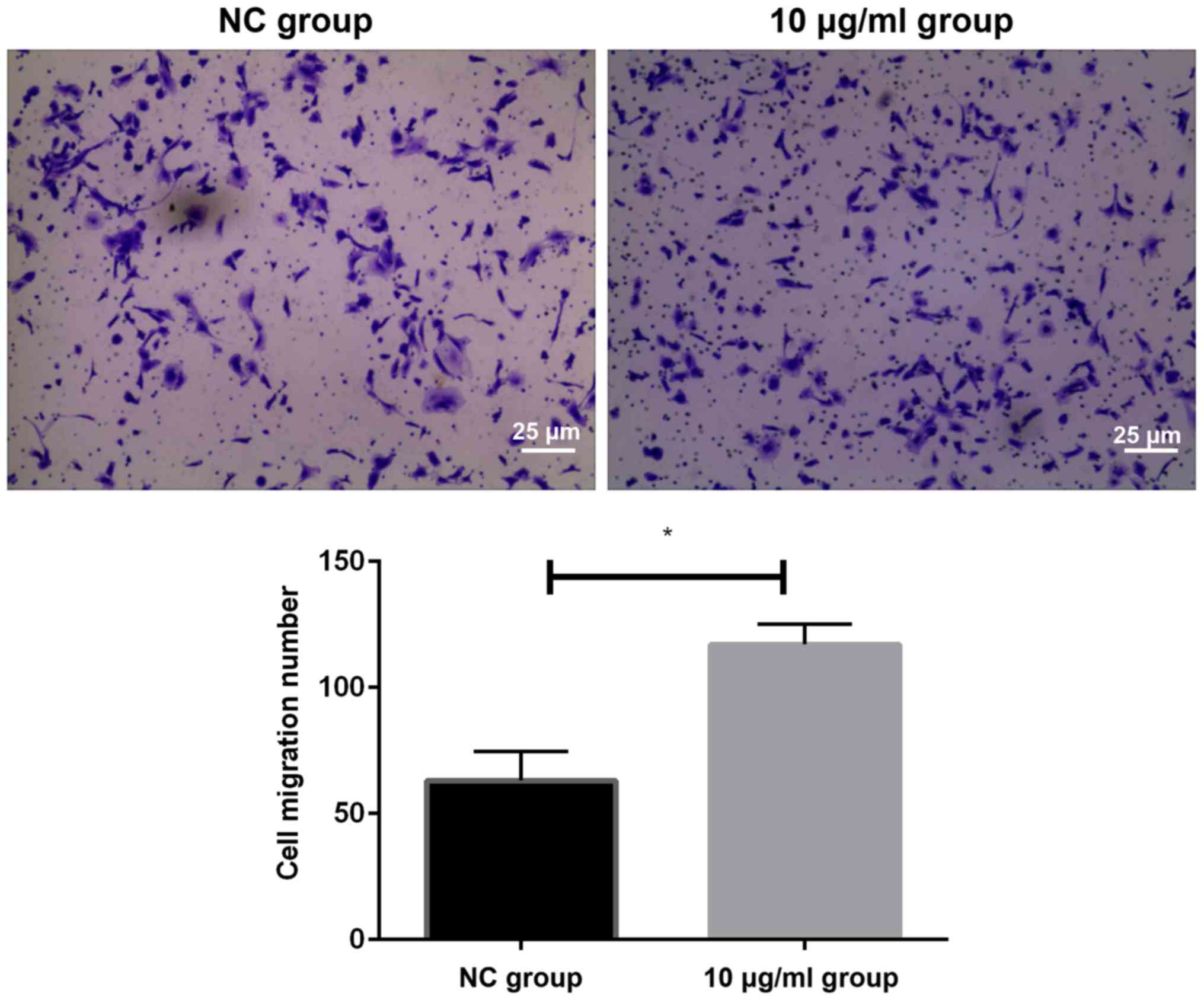 We detected the migration of cells in two groups by Transwell invasion assay. The results showed that the number of migrating cells in HeLa cells after 10 µg/ml PM2.5 stimulation was significantly higher than that in NC group (P<0.05). It could be concluded that an appropriate concentration of PM2.5 could increase the invasion ability of HeLa cells (Fig. 2).