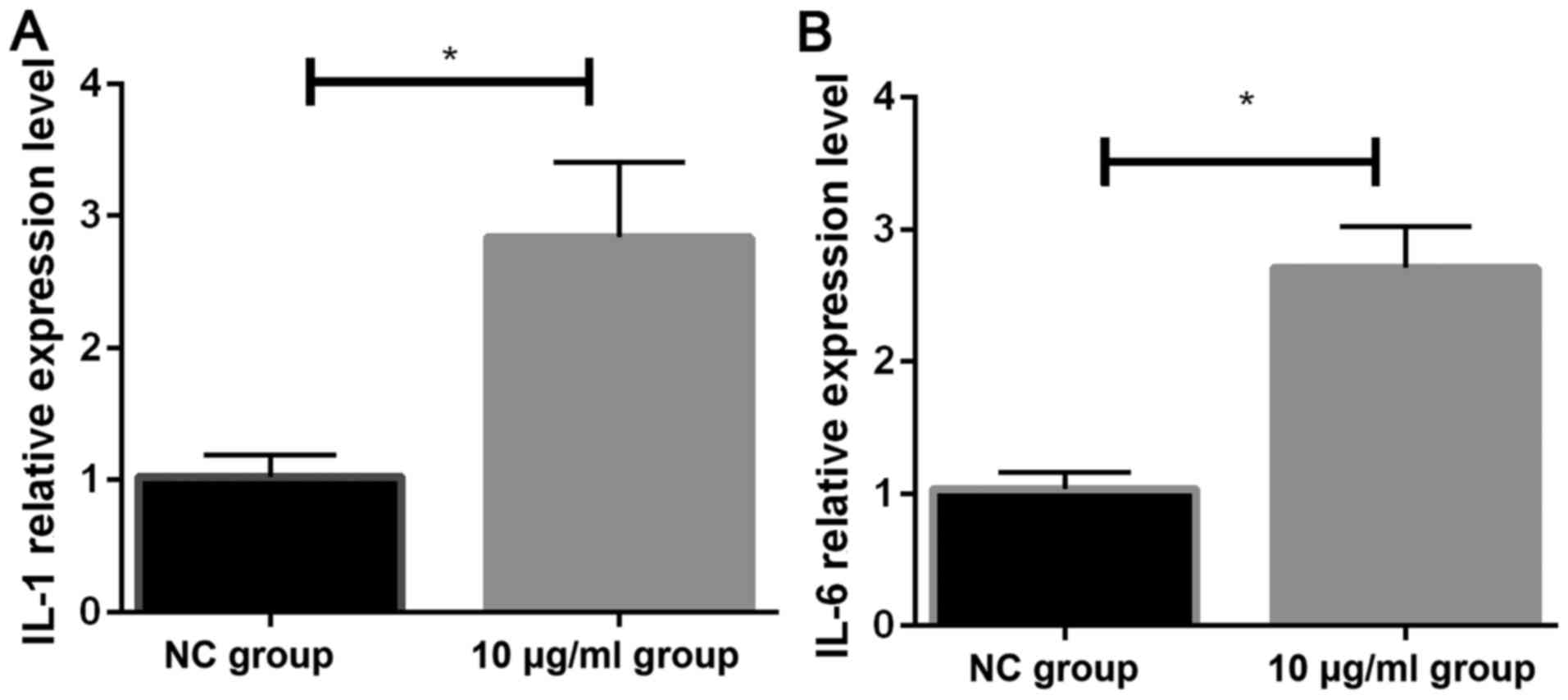 The expression of IL-1 mRNA and IL-6 mRNA in two groups of cells was detected by RT-qPCR. The relative expression levels of IL-1 mRNA (2.84±0.57) and IL-6 mRNA (2.71±0.31) in HeLa cells stimulated by 10 µg/ml PM2.5 were significantly higher that the expression levels of IL-1 mRNA (1.021±0.171) and IL-6 mRNA (1.035±0.023) in NC group (both P<0.05) (Fig. 4).