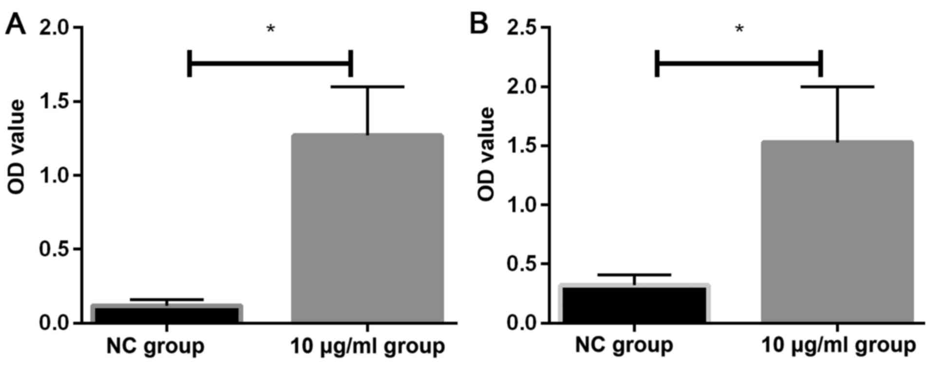 According to the manufacturer's instructions, the test was performed as follows: the collected cells were added to 50 µl of standard substance solution at different concentrations in blank micropores; 50 µl of distilled water were added to the blank control well and 50 µl of antibody were added. In the rest of the micropores, 40 µl of the sample were firstly added and then 10 µl of the biotin-labeled antibody were added. The plate was sealed and incubated at 37°C for 30 min. When the plate was washed in each well, it was ensured that it was full and not overflowing; it was left to stand for 30 sec, discarded and patted dry, 5 times in total. After 50 µl enzyme-labeled solution was added to each hole, the plate was sealed again and incubated at 37°C for 60 min. The plate was washed again for 5 times, and patted dry with absorbent paper at the last time. A total of 100 µl/well horseradish peroxidase marker was added before sealing the plate and incubated in the dark under 37°C for 15 min. Another 100 µl/well chromogenic substrate TMB was added, and incubated in the dark at room temperature for 20 min. Finally, 50 µl/well stop buffer was added, and enzyme standard instrument was used for testing within 15 min. The maximum absorption wavelength of 450 nm was measured. Three sets of repeat wells were set, and the experiment was repeated for 3 times.