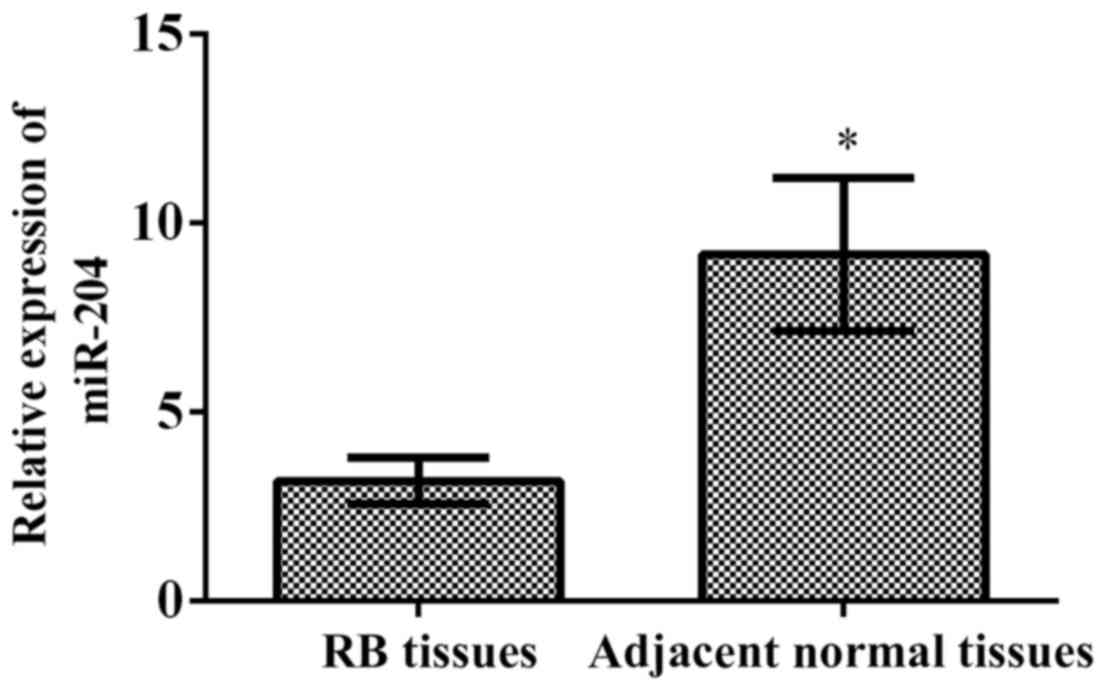 The results of RT-qPCR showed that the relative expression of miR-204 in RB tissues was 3.164±0.611, and in para-carcinoma normal tissues was 9.164±2.016. The relative expression of miR-204 in RB tissues was significantly lower than that in para-carcinoma normal tissues (p<0.001) (Fig. 1).