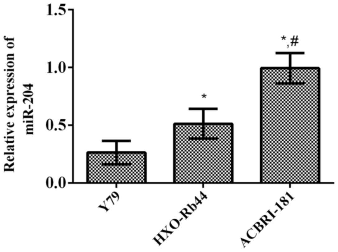 Micro-ribonucleic acid (miRNA) is a newly-discovered highly-conserved endogenous non-coding hairpin nucleotide transcript, ~19–25 bases in length, which widely exists in eukaryotic cells and is generated by the endogenous pre-miRNA via Dicer cleavage, with 18–25 nucleotides in size (6,7). miRNA plays different roles in different physiological processes, including developmental regulation, nervous system development, cell proliferation and apoptosis. Moreover, miRNA widely exists in tissues and cells, and is involved in a series of vital activities, such as individual development, cell proliferation, apoptosis and differentiation, which is closely related to the occurrence and development of a variety of malignant tumors, so it can serve as a therapeutic target for various malignant tumors (8,9). Currently, a large number of studies have found that some specific miRNAs are abnormally expressed in RB and have close associations with the occurrence and development of RB (10). miR-204 has been studied in a variety of malignant tumors, including breast, gastric, prostate and endometrial cancer, and its expression is low in these tumors. miR-204 can bind to target genes to be involved in the pathway of tumor cells, affecting the growth of tumor cells and playing a role as cancer suppressor gene in a variety of malignant tumors (11,12). Y79 cells are established via the primary culture of tumors resected from the right eye of RB patients with a strong RB maternal familial heredity, whose ultrastructures, such as nuclear membrane infolding, trilamellar membrane structure, coated vesicle, microtubule, centriole, annulate lamellae and basal granule, are similar to those of RB (13).