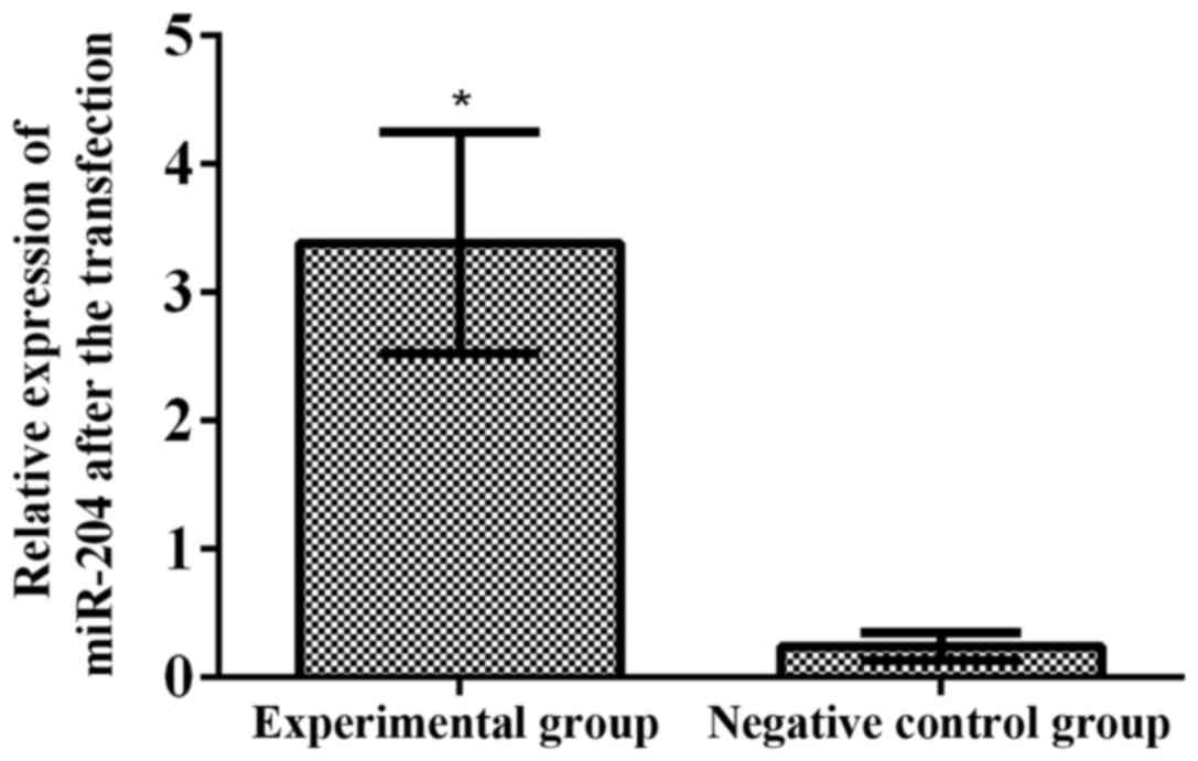 To further study the effect of miR-204 on the biological behavior of RB, Y79 cells were transfected with miR-204. The results of RT-qPCR showed that the relative expression level of miR-204 in the experimental group (3.386±0.863) was significantly higher than that in the negative control group (0.244±0.107) after transfection (p<0.001) (Fig. 3).