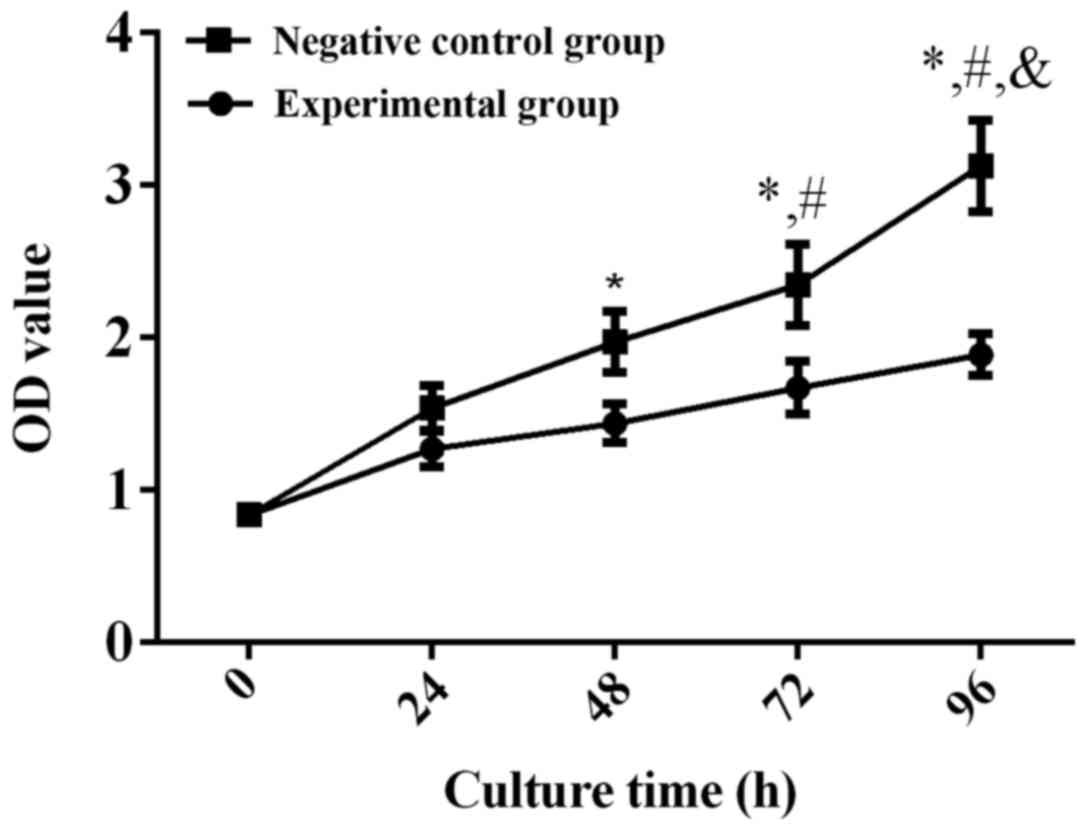 Cell proliferation was detected by the MTT method. The cells in the logarithmic growth phase were prepared into the cell suspension (1×105) and inoculated into a 96-well plate at a density of 3×103 cells/well. The cell viability was detected by MTT once every 24 h, 4 times until 96 h. For the detection, 20 µl MTT solution (5 mg/ml) were added into each well. After cells being incubated in the incubator for 4 h, the culture medium was discarded and 150 µl DMSO were added into each well. The crystals were dissolved via vibration for 10 min at room temperature. The optical density (OD) at the wavelength of 490 nm in each well was repeatedly detected 3 times using a microplate reader. Apoptosis was detected by flow cytometry. The cells transfected for 48 h were collected and digested by trypsin, and then washed with 0.01 mol/l cold phosphate-buffered saline (PBS). The supernatant was discarded after centrifugation at 111.8 × g under the temperature of 25°C. The cells were re-suspended with 100 µl 1X binding buffer, and then transferred to the flow detection tube. A total of 5 µl 7-AAD and 5 µl PE Annexin V were added into each tube, followed by reaction for 15 min at room temperature without light. Then 400 µl 1X binding buffer were added. Flow cytometry was completed within 1 h, and each specimen was repeatedly detected 3 times.
