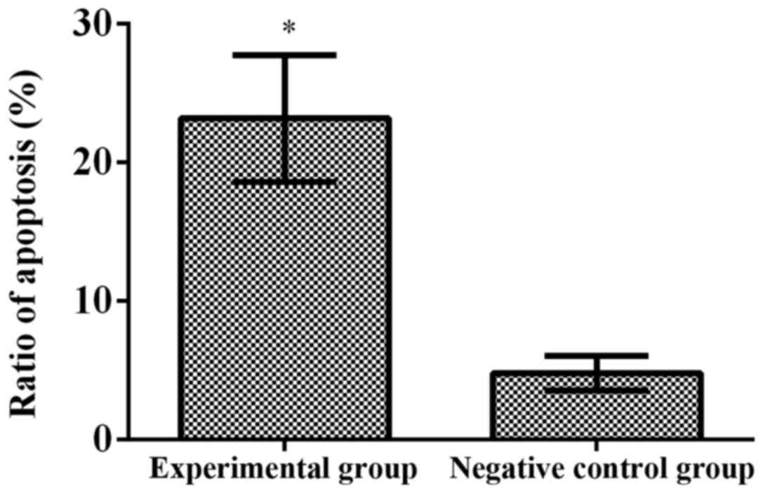 To further study the effect of miR-204 on the apoptosis of human RB Y79 cells after transfection, the proportion of apoptotic human RB Y79 cells was detected via flow cyto- metry. The results revealed that the proportion of apoptotic cells in the experimental group (23.16±4.58%) was obviously higher than that in the negative control group (4.77±4.58%) after transfection with miR-204 (p<0.001) (Fig. 5).