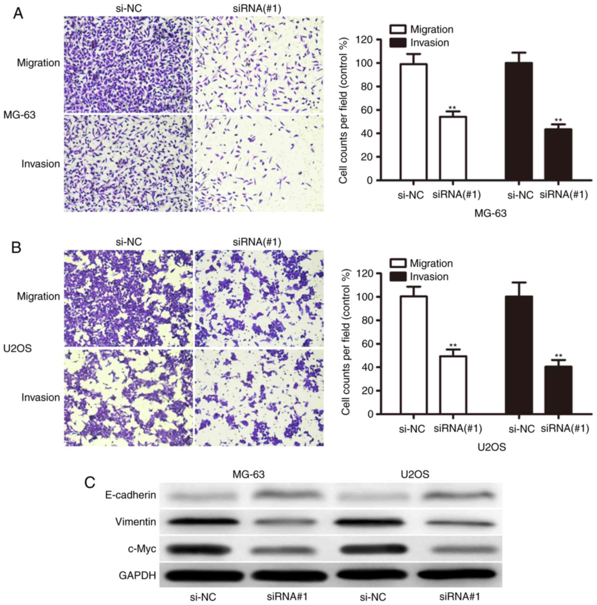 To investigate the potential role of XIST in OS metastasis, the present study detected the effect of XIST on the migration and invasion capacity of OS cells. We found that XIST knockdown dramatically decreased their migration and invasion capabilities in both MG-63 (Fig. 4A) and U2OS (Fig. 4B) cells. We then sought to explore whether there was some interaction between proliferation- and metastasis-related markers and XIST expression. Interestingly, XIST knockdown upregulated E-cadherin and repressed Vimentin and c-Myc (Fig. 4C), which are clearly involved in OS cell proliferation and invasion. These results indicated that XIST functioned as an oncogene and promoted the invasion of OS cells.