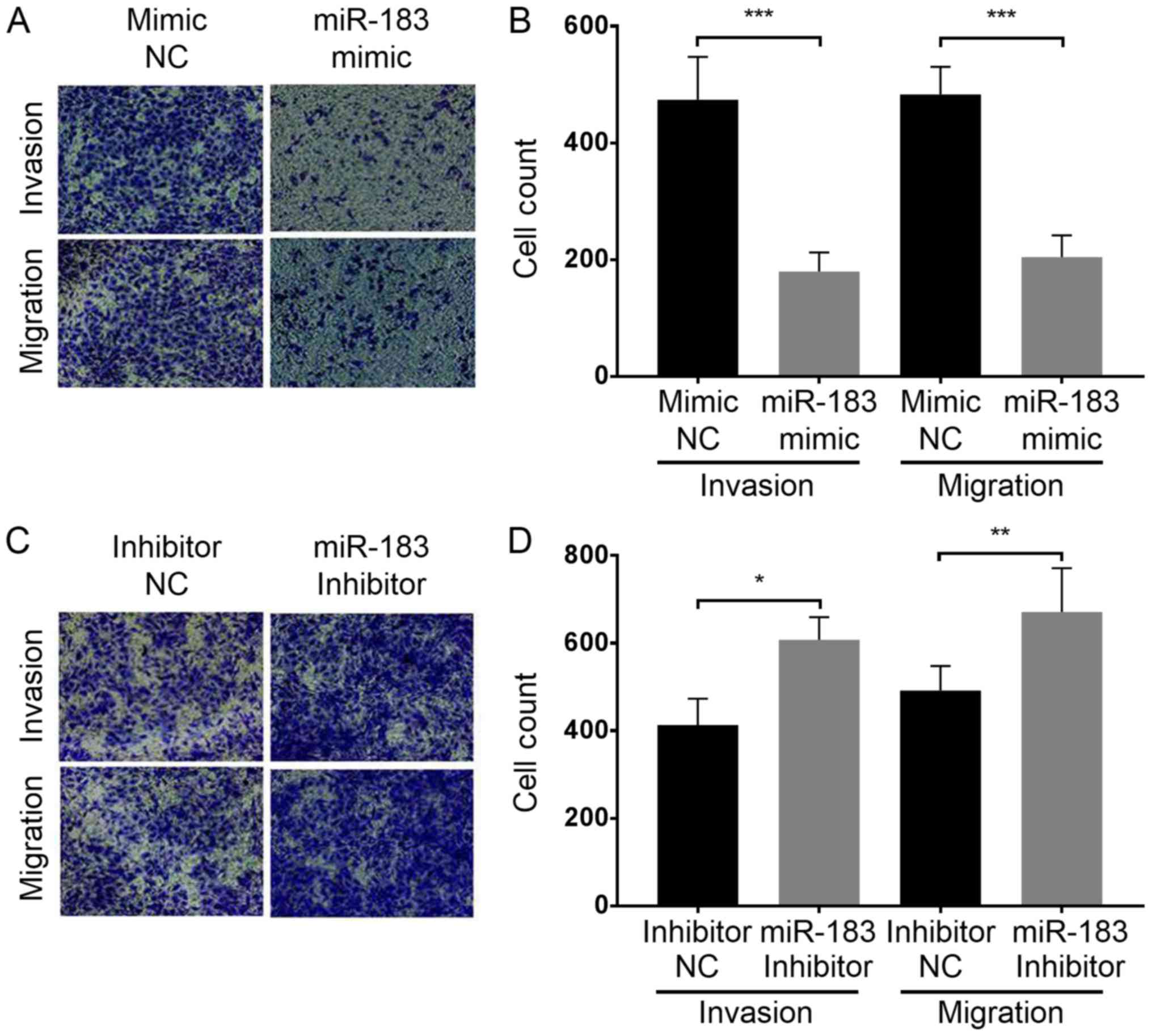 To assess the influence of miR-183 expression changes on A375 cell migration, a scratch assay was performed as aforementioned. The results demonstrated that the artificial upregulation of miR-183 expression significantly suppressed A375 cell migration, whereas miR-183 downregulation promoted A375 cell migration when compared with their respective controls (Fig. 2). This indicated that miR-183 inhibits the migration of A375 cells in vitro. To further evaluate the influence of miR-183 expression change on A375 cell migration and invasion, a Transwell assay was performed with each group of cells as aforementioned. The results demonstrated that miR-183 overexpression in the miR-183 mimic group significantly inhibited the migration and invasion of A375 cells in vitro compared with the mimic NC group (Fig. 3A and B). Furthermore, miR-183 knockdown in the inhibitor group promoted A375 cell migration and invasion compared with the inhibitor NC group (Fig. 3C and D). Taken together, this indicates that miR-183 suppresses A375 cell migration and invasion in vitro, and migration and invasion are increased by the downregulation of miR-183.