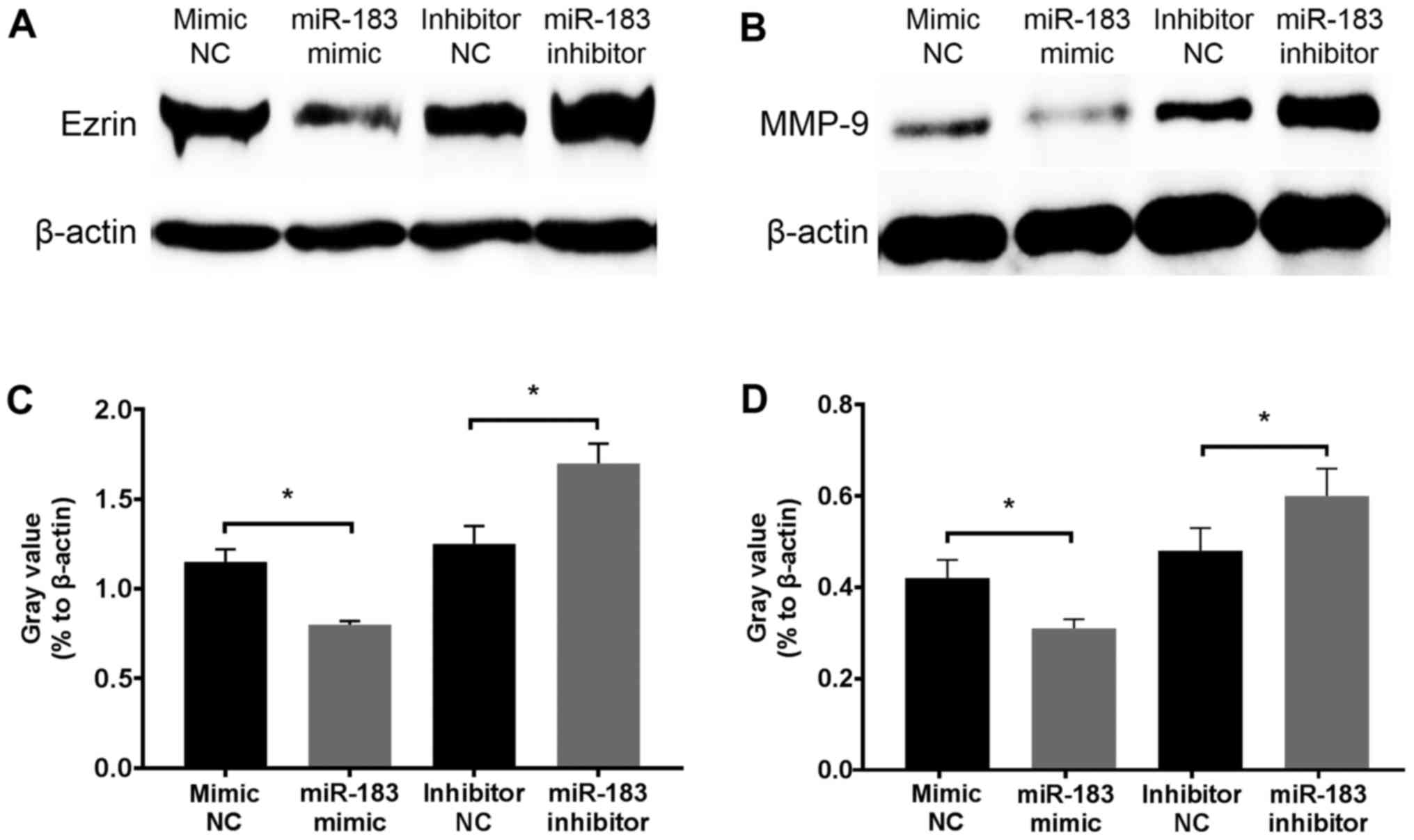 Zhu J, Feng Y, Ke Z, Yang Z, Zhou J, Huang X and Wang L: Down-regulation of miR-183 promotes migration and invasion of osteosarcoma by targeting Ezrin. Am J Pathol. 180:2440–2451. 2012. View Article : Google Scholar : PubMed/NCBI | |
