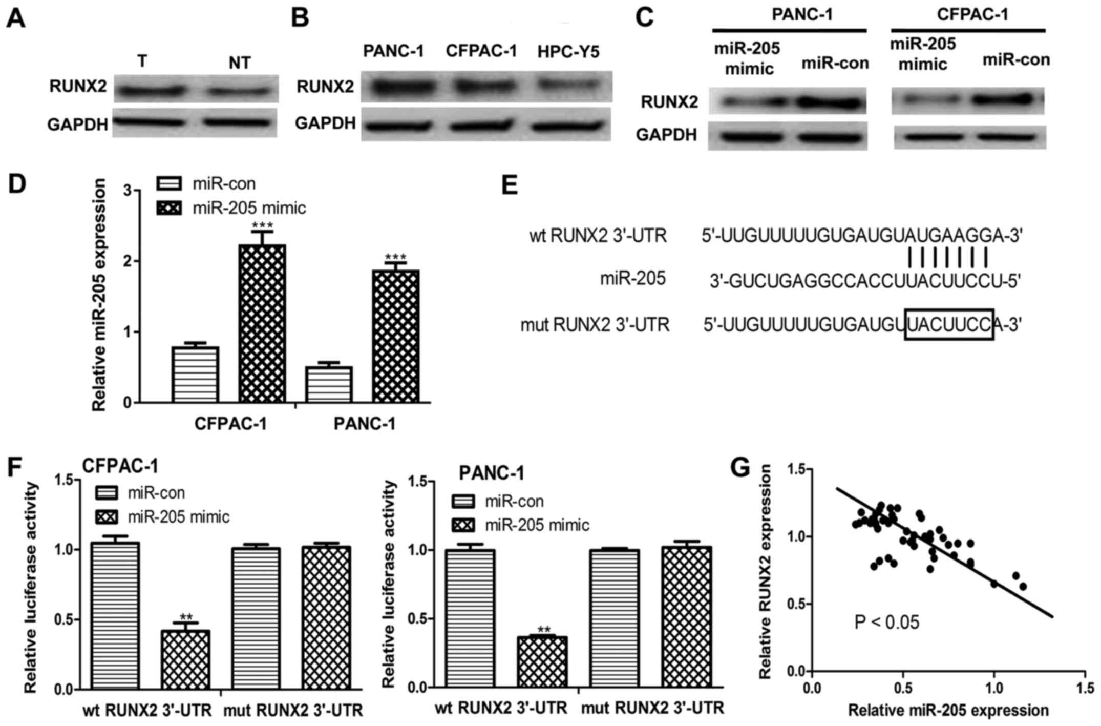 In summary, the current results demonstrated that miR-205 may serve a critical role in the development and progression of PC. miR-205 was validated as a tumor suppressor in PC through the regulation of RUNX2 expression. The current study provided critical insights into the use of miR-205 as a potential therapeutic miRNA for PC.