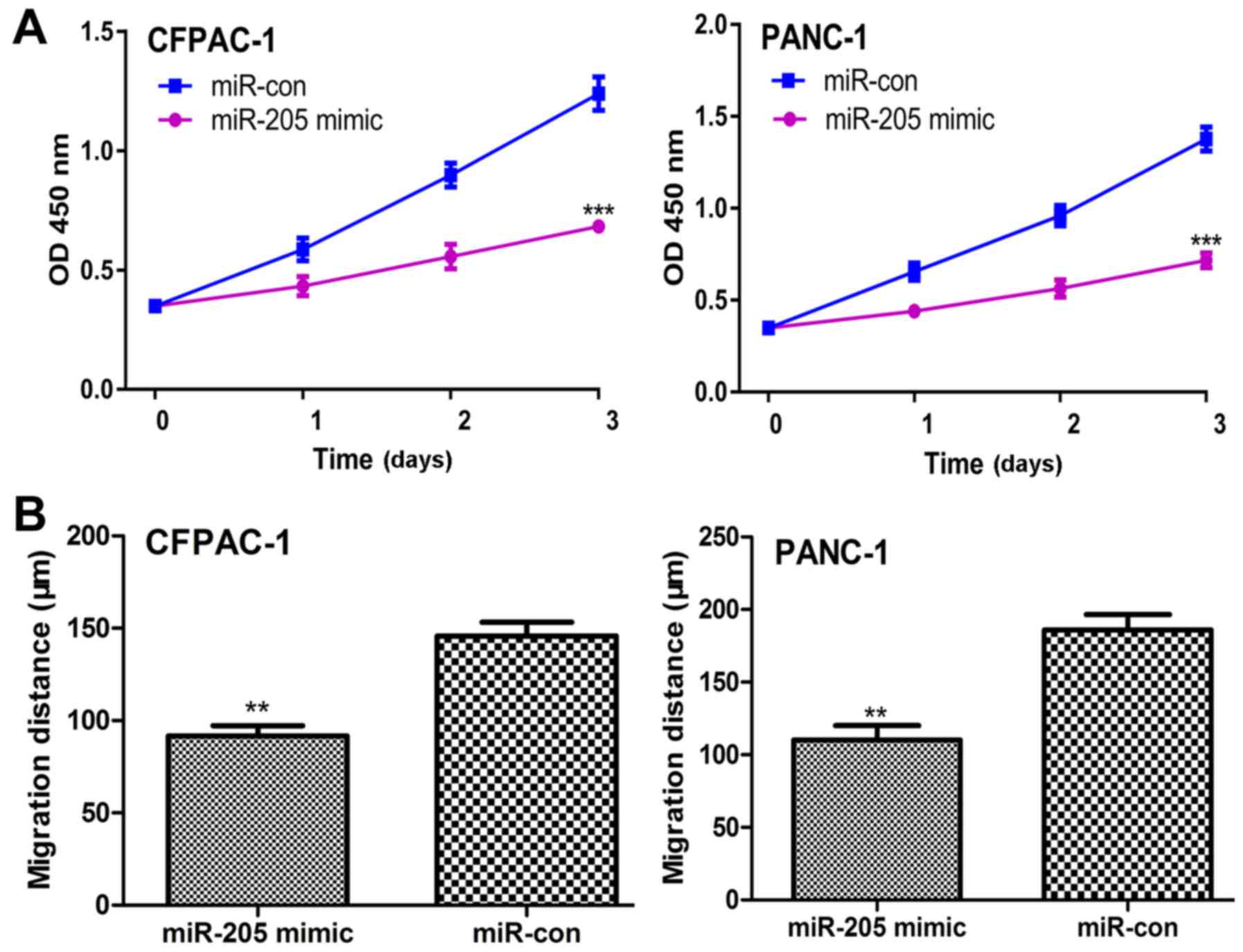The effects of miR-205 expression on PC cell proliferation and migration were assessed by CCK-8 and wound healing assays, respectively. It was identified that the rate of cellular proliferation in PC cells transfected with miR-205 mimic was significantly lower compared with those transfected with miR-con (Fig. 3A). A significant decrease was also identified in the rate of cell migration in miR-205 mimic transfected PC cells compared with those transfected with miR-con (Fig. 3B).