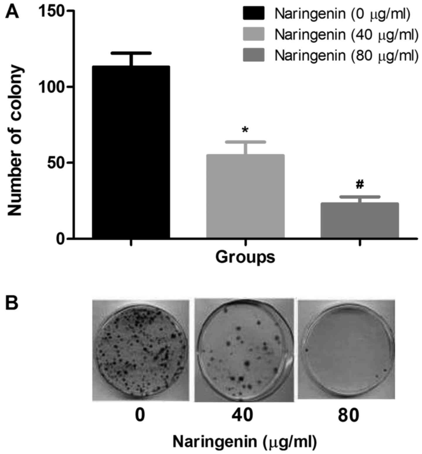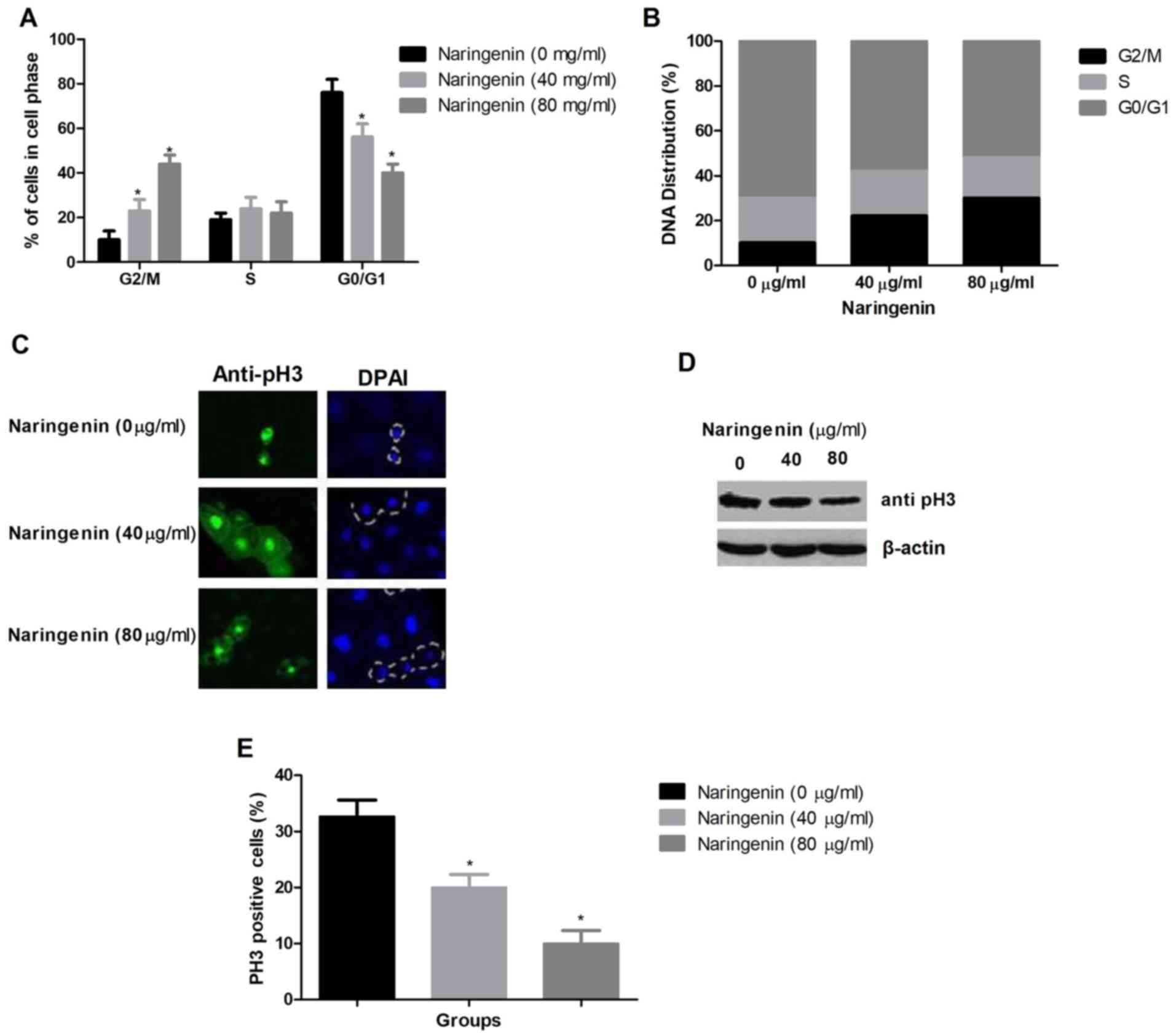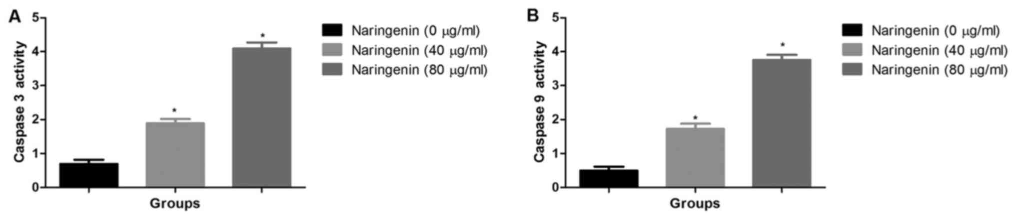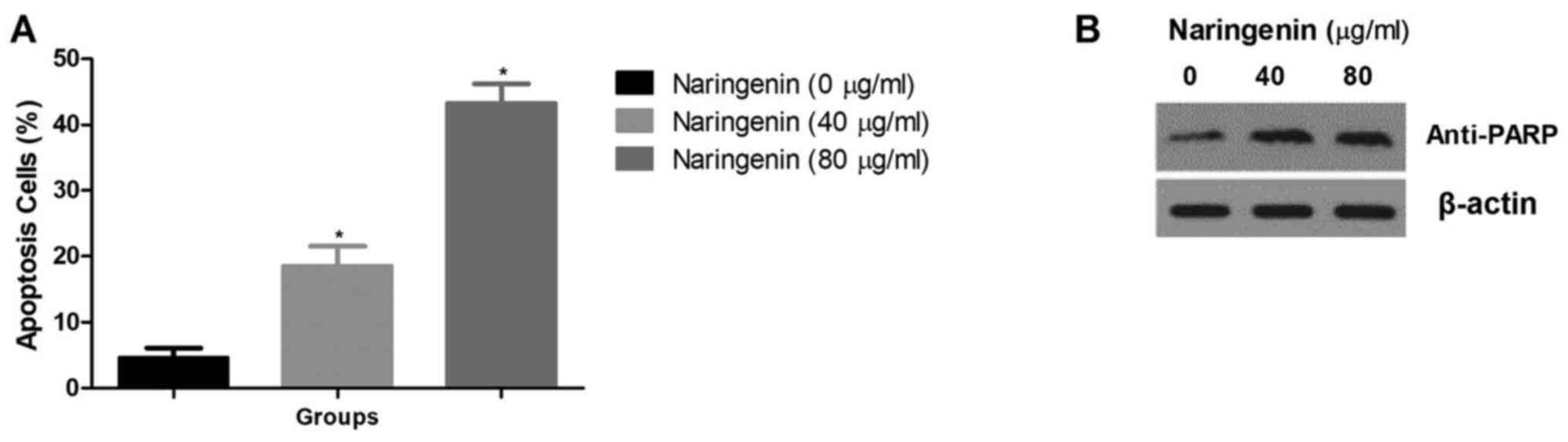 Arul D and Subramanian P: Naringenin (citrus flavonone) induces growth inhibition, cell cycle arrest and apoptosis in human hepatocellular carcinoma cells. Pathol Oncol Res. 19:763–770. 2013. View Article : Google Scholar : PubMed/NCBI