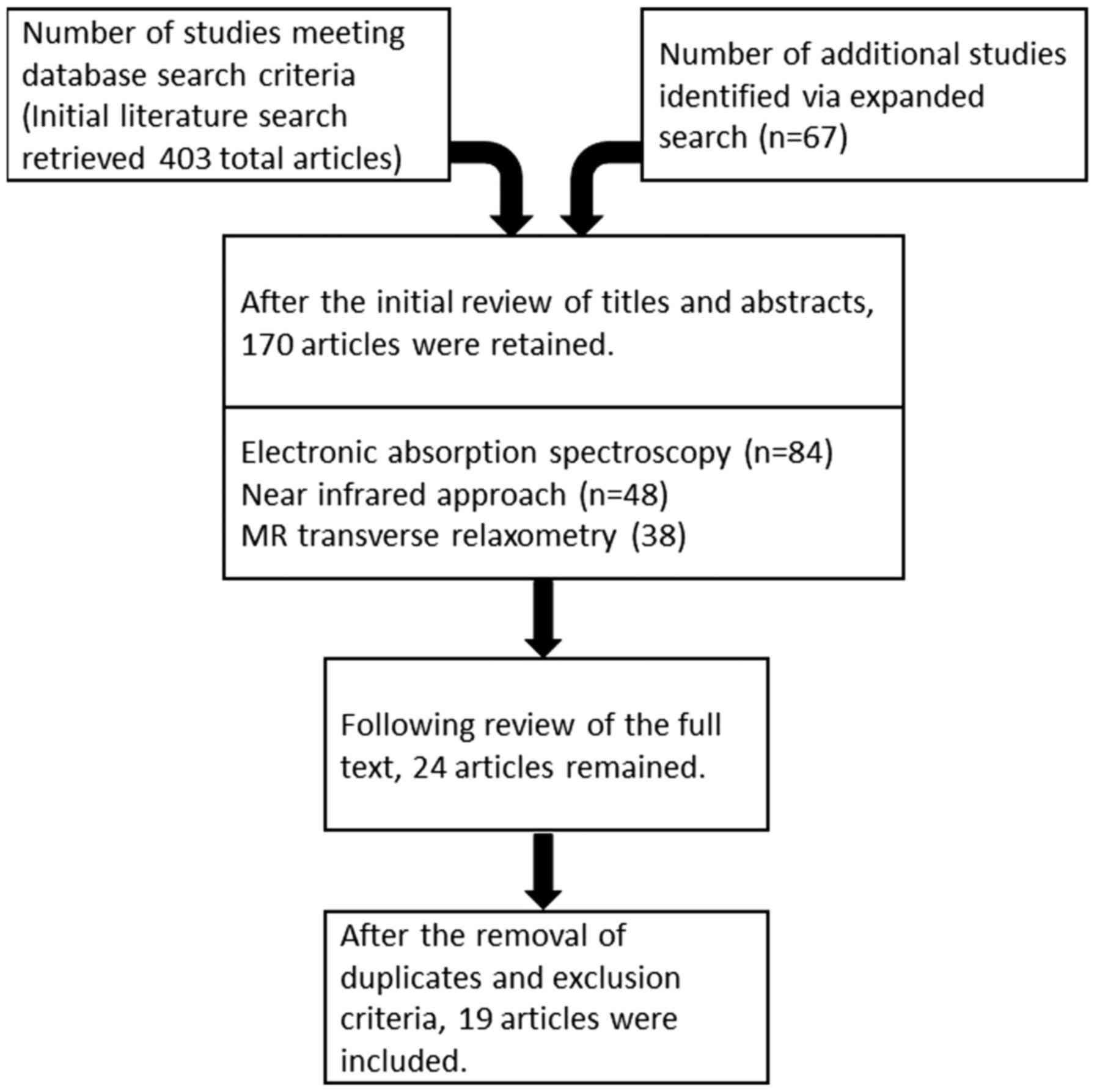 The differential diagnosis between EAOC with predominantly cystic appearances and benign OE is difficult and require quantitative parameters that reflect the metabolic and biochemical state of cyst fluid, which are translated into disease diagnosis. When compared to subjects with benign OE, cyst fluid analysis revealed low concentrations of Hb and iron-related compounds in EAOC (7). This observation reveals the possibility of early detection of biochemical changes before morphological variations are captured through ultrasonographic and MRI diagnosis. Investigators highlighted practical applications of measuring these metabolic and biochemical markers for discrimination between benign and malignant endometriosis (7–9). Since the cyst fluid sampling is not a serum-based test, noninvasive techniques for assessment of cyst fluid levels of Hb-related compounds are clinically required. Hb displays absorption spectra in the visible and UV regions (10). The specific spectroscopic changes are invaluable for diagnostic applications of the concentration of Hb (10). Such novel diagnostic modalities include electronic absorption spectroscopy, near infrared approach and MR transverse relaxometry.
