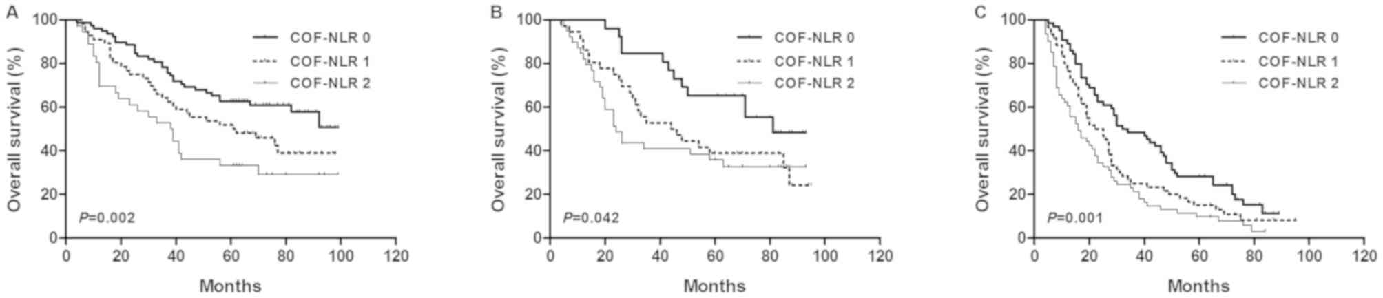 According to the grading system of the COF-NLR score, 168 (36.8%) patients had a COF-NLR score of 0, 152 (33.3%) patients had a COF-NLR score of 1 and 136 (29.8%) patients had a COF-NLR score of 2. The 5-year OS rates for patients with COF-NLR scores of 0, 1 and 2 were 50.0, 34.2 and 23.5%, respectively (P<0.001; Fig. 3). Therefore, it was possible to classify the patients into three distinct prognostic groups using the preoperative COF-NLR score.