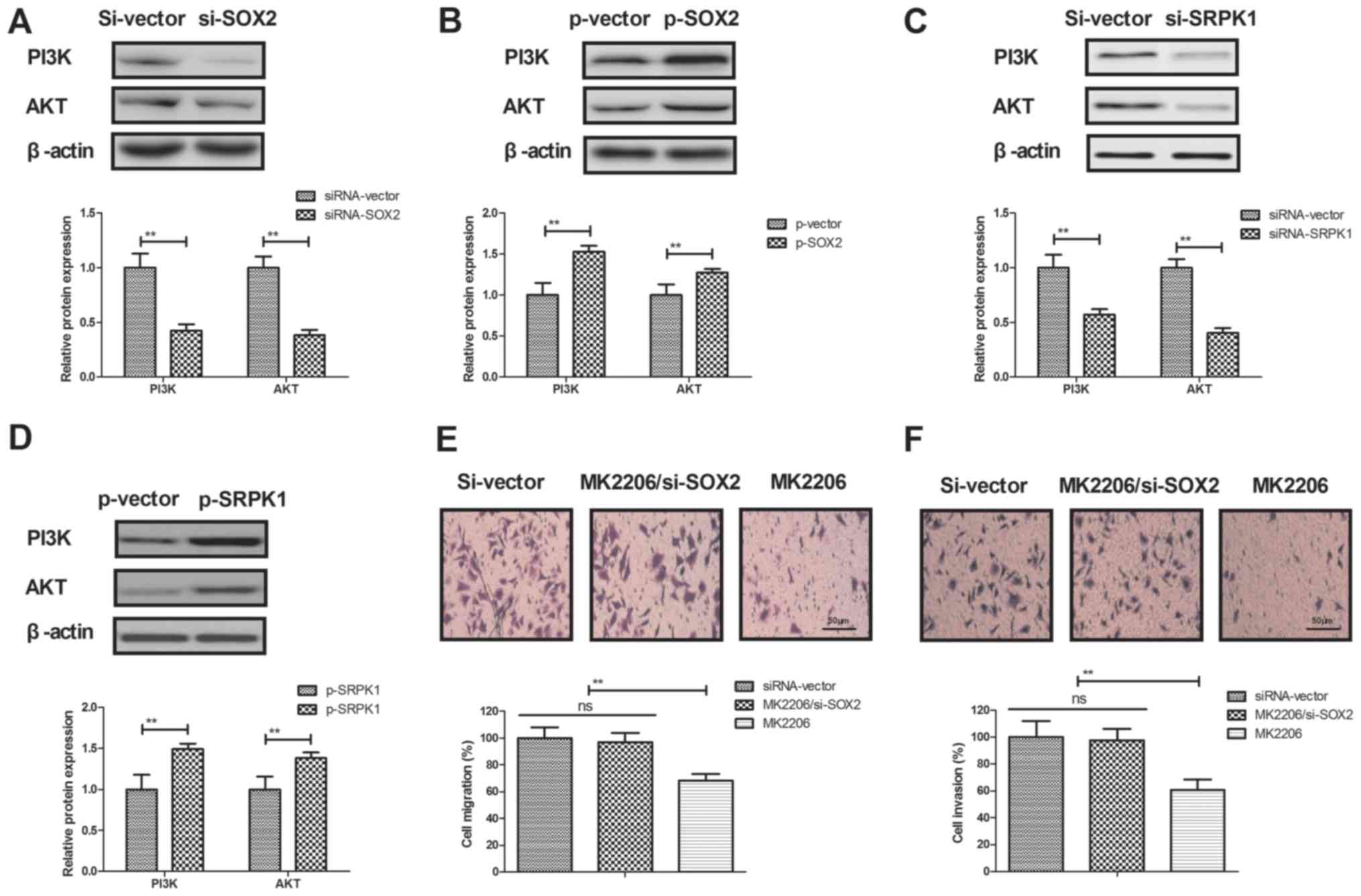 A previous study has indicated that SRPK1 promotes the activation of PI3K/AKT signaling in the metastasis of human cancer (35). In the present study, the association between SOX2 and the PI3K/AKT signaling pathway was explored in BCC cells. As shown in Fig. 5A and B, SOX2 knockdown markedly decreased the expression levels of PI3K and AKT in BCC cells, while SOX2 overexpression significantly increased these levels. It was also observed that SRPK1 knockdown markedly decreased the expression levels of PI3K and AKT in BCC cells, whereas SRPK1 overexpression increased these levels (Fig. 5C and D). However, activation of the PI3K/AKT pathway by MK2206 abrogated the inhibitory effects of SOX2 knockdown on BCC cell migration and invasion (Fig. 5E and F). Thus, these results suggest that SOX2 knockdown inhibits BCC cell invasion through the PI3K/AKT signaling pathway.