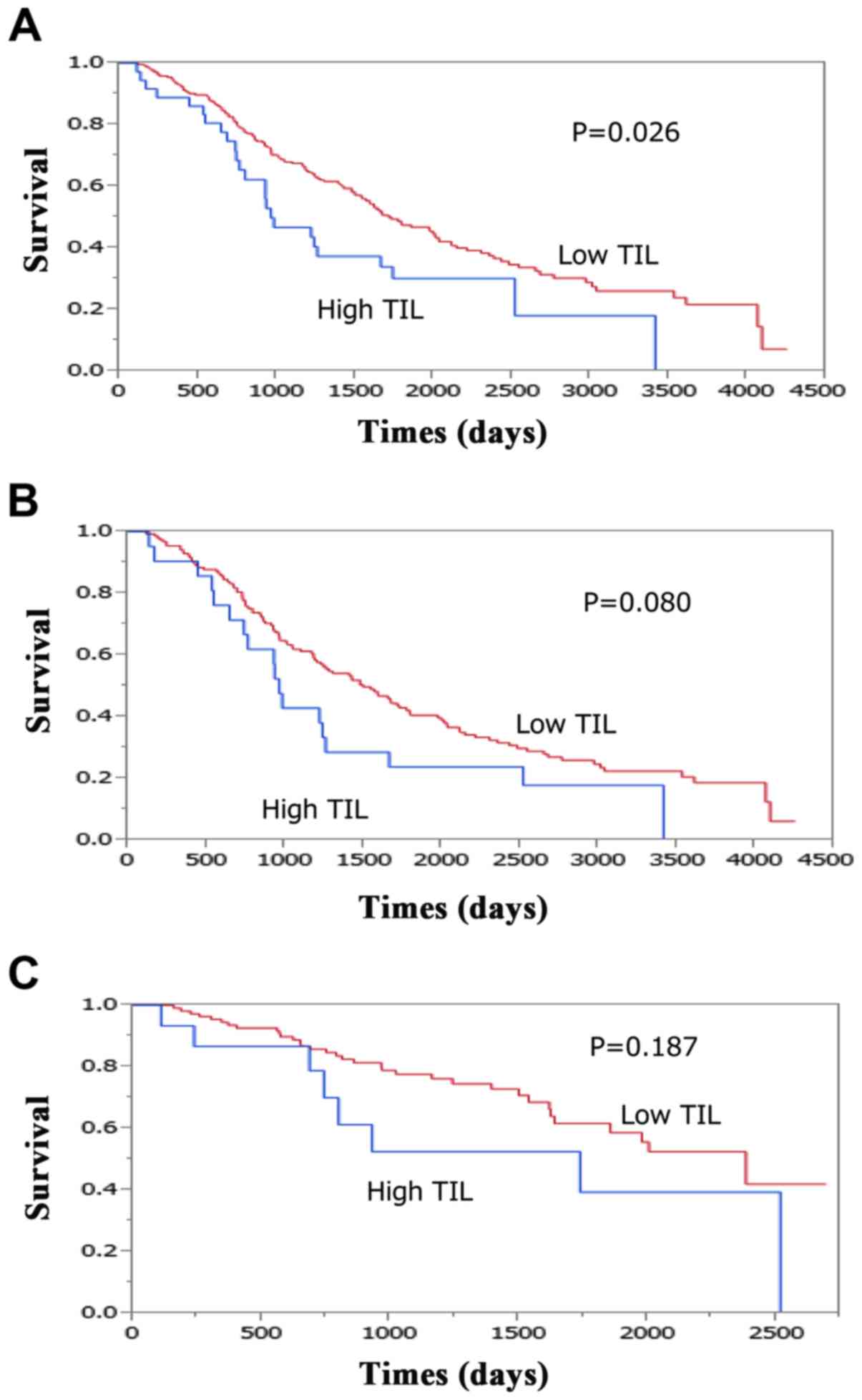 The TIL distributions are shown in Table II. Percentages of TILs did not differ significantly among the three groups (P=0.556). In previous reports, various cut-off points were utilized (10, 35, 50 and 60%) (14,25,27,28,33). However, there are as yet no standardized cut-off points. We selected a 30% cut-off point from among the potential values because there were few cases with TIL proportions lower than 10% or more than 50% in our study. We thus conducted the following analyses employing 30% as the cut-off point.