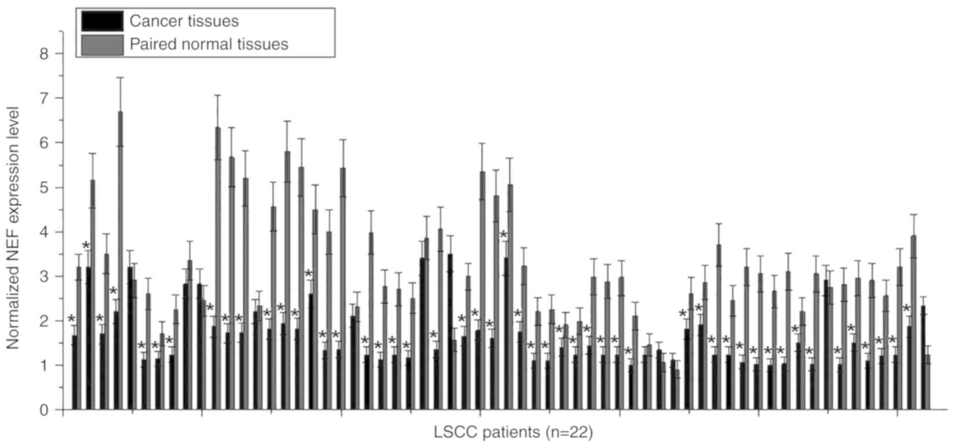 Differential expression in tumor tissues and adjacent healthy tissues usually indicates the involvement of a certain gene in cancer. To investigate the involvement of NEF in LSCC, the expression of NEF in tumor tissues and paired normal tissues was detected in 62 patients with LSCC via RT-qPCR. As shown in Fig. 1, downregulation of NEF in tumor tissue compared with in adjacent healthy tissue was identified in 50/62 patients (80.6%). Therefore, downregulation of NEF may be involved in the pathogenesis of LSCC.