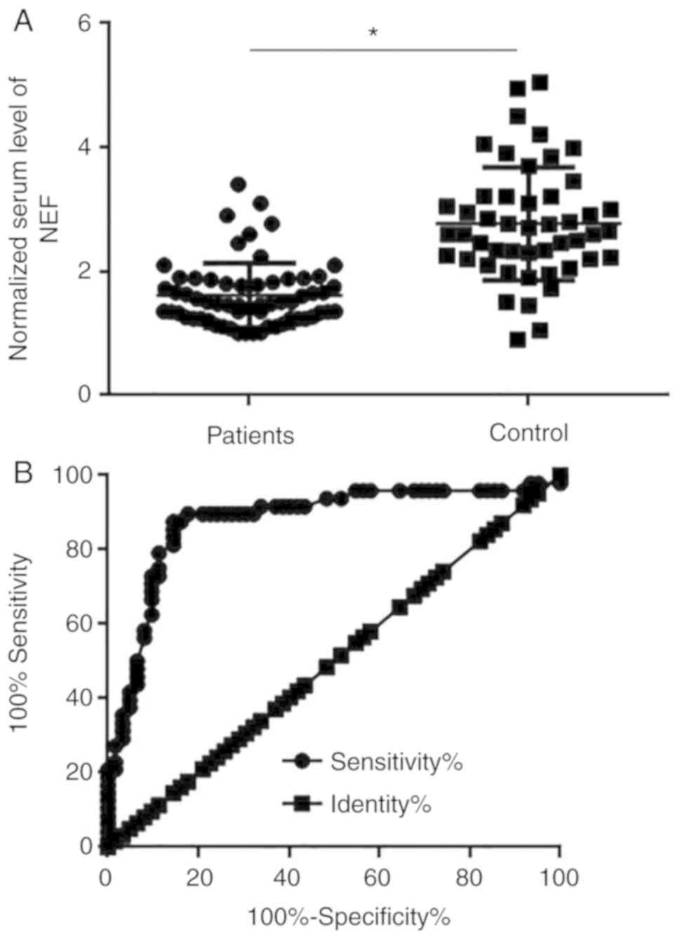 Pathological examination is the gold standard for the diagnosis of human cancer; however, the application of biopsy is occasionally limited by its invasive nature. The development of human disease is usually accompanied by changes in certain substances in the circulatory system, such as blood flow, and blood biomarkers are currently used in a number of aspects of cancer diagnosis (17,18). In the present study, serum levels of NEF were significantly lower in patients with LSCC than in healthy controls. ROC curve analysis further confirmed that low serum levels of NEF may be used to effectively distinguish patients with LSCC from healthy controls. Therefore, measurement of serum levels of NEF may be performed to aid the diagnosis of LSCC in cases where biopsy is not applicable. However, changes in the expression pattern of NEF may also form part of other diseases. Therefore, diagnosis based on multiple factors should be performed to improve accuracy.