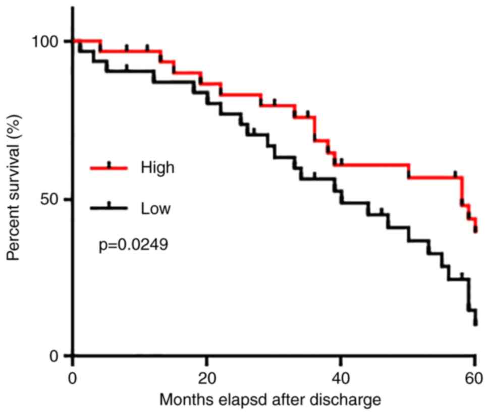 Tumor distant metastasis is a major cause of mortality in patients with LSCC. The data in Table I demonstrated that serum levels of NEF were not affected by the existence of distant metastasis. Therefore, follow-up data of all patients with LSCC were analyzed. Patients were divided into high (n=31) and low (n=31) groups according to the median serum level of NEF. Survival curves of these two groups were plotted using the Kaplan-Meier method and further compared using a log-rank test (Fig. 3). The overall survival rate of the low expression group was significantly worse than that of the high expression group (P=0.0249).