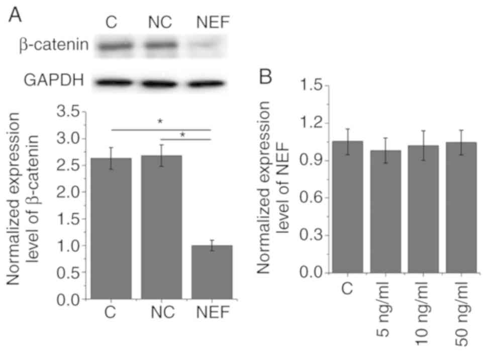 Effects of NEF overexpression on expression of β-catenin in the human LSCC cell line UM-SCC-17A. The data in Table I suggested that NEF may be involved in the growth of LSCC. The Wnt/β-catenin signaling pathway serves a pivotal role in cancer growth by stimulating cancer cell proliferation and inhibiting apoptosis (12,13). Therefore, the present study investigated the effects of NEF overexpression on β-catenin in the human LSCC cell line UM-SCC-17A. As shown in Fig. 4A, NEF overexpression significantly inhibited the expression of β-catenin (P<0.05). Conversely, following treatment with Wnt agonist (a potent and selective activator of Wnt signaling) at a dose of 5, 10 and 50 ng/ml, no significant effects on NEF expression (NEF expression levels were normalized to GAPDH as an endogenous control) were identified (P<0.05; Fig. 4B).