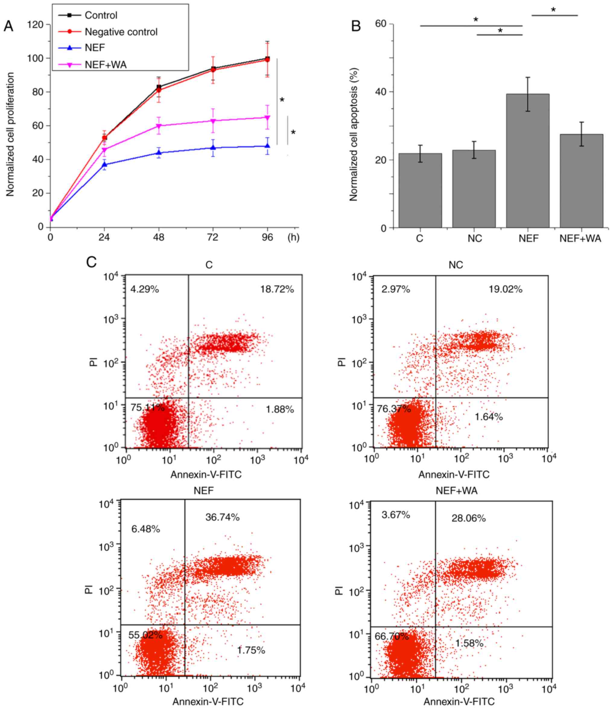 As shown in Fig. 5A, NEF overexpression significantly inhibited the proliferation of UM-SCC-17A cells (P<0.05). In addition, NEF overexpression significantly promoted apoptosis of UM-SCC-17A cells (P<0.05; Fig. 5B and C). However, Wnt agonist treatment at a dose of 10 ng/ml significantly reduced the effects of NEF overexpression on proliferation and apoptosis of UM-SCC-17A cells (P<0.05; Fig. 5A-C). The percentages of apoptotic cells in the control, negative control, NEF and NEF + Wnt agonist groups were 20.6, 20.66, 38.29 and 29.64% of the total number of cells, respectively.