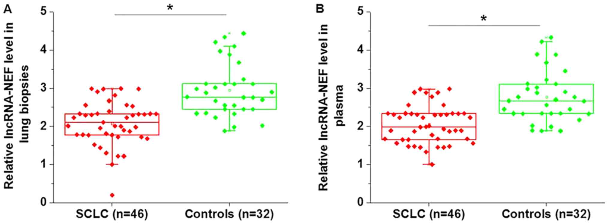 Expression level of lncRNA-NEF was detected in the lung tissue and plasma of patients with SCLC, and in healthy controls. As illustrated in Fig. 1, the expression levels of lncRNA-NEF were significantly lower in the lung tissue (Fig. 1A, P<0.05) and plasma (Fig. 1B, P<0.05) of patients with SCLC, compared with those of the healthy controls.
