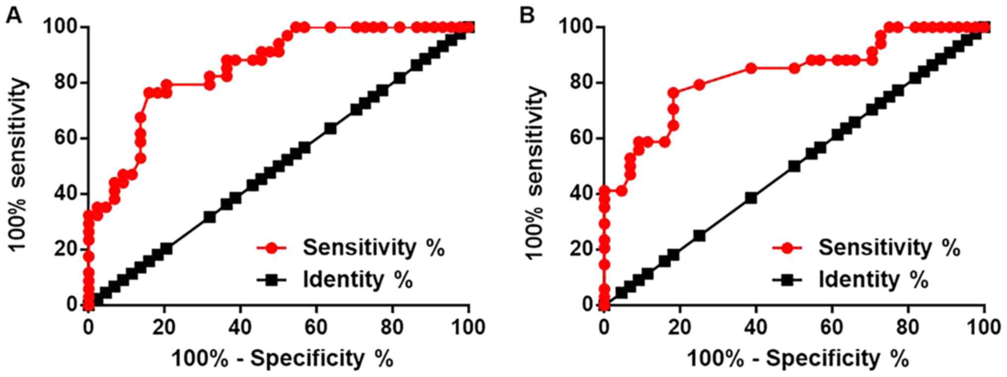 Receiver operating characteristic curve analysis was performed to evaluate the diagnostic value of lncRNA-NEF in SCLC. For lncRNA-NEF expression in lung biopsies, the area under the curve (AUC) was 0.8549, with a standard error of 0.04144 and a 95% confidence interval of 0.7737–0.9362 (Fig. 2A). For lncRNA-NEF expression in plasma, the AUC was 0.8309, with a standard error of 0.04755 and a 95% confidence interval of 0.7377–0.9241 (Fig. 2B).