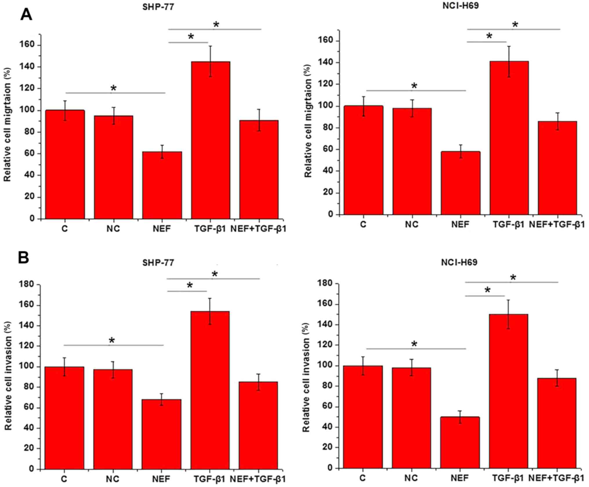 The aforementioned results indicated the involvement of lncRNA-NEF in SCLC metastasis. To further support these findings, lncRNA-NEF expression vectors were transfected into SHP-77 and NCI-H69 cell lines, and cell migration and invasion were assessed using Transwell migration and invasion assays, respectively. Compared with the control and negative control cells, the cells overexpressing lncRNA-NEF demonstrated a significant reduction in migration (Fig. 3A) and invasion (P<0.05; Fig. 3B). By contrast, treatment with 10 ng/ml exogenous TGF-β1 significantly promoted cell migration and invasion, and reduced the inhibitory effects of lncRNA-NEF overexpression on cell migration and invasion (P<0.05).
