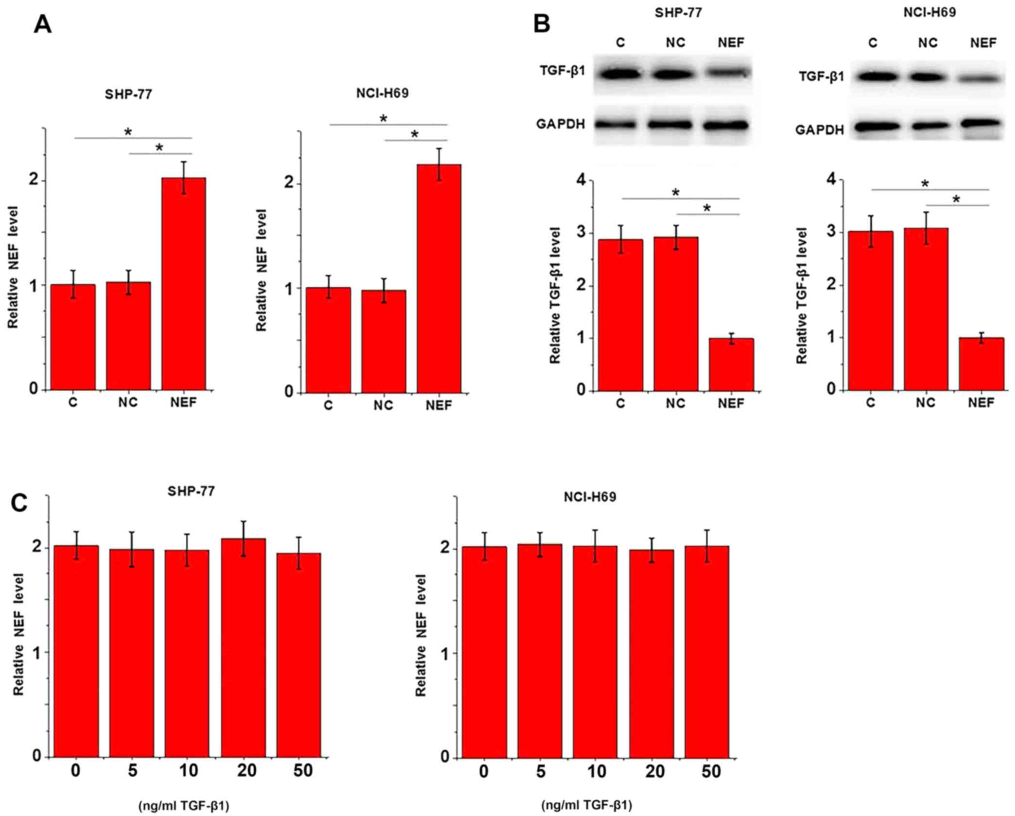 To further investigate the interactions between TGF-β1 and lncRNA-NEF, the expression level of TGF-β1 following lncRNA-NEF overexpression was detected using western blotting. As displayed in Fig. 4A, overexpression of lncRNA-NEF was achieved in two SCLC cell lines (P<0.05). Compared with the control and negative control cells, cells overexpressing lncRNA-NEF exhibited significantly lower TGF-β1 expression levels (active homodimer; Fig. 4B; P<0.05). By contrast, treatment with exogenous TGF-β1 at 5, 10, 20 and 50 ng/ml did not significantly effect lncRNA-NEF expression (Fig. 4C; P>0.05).