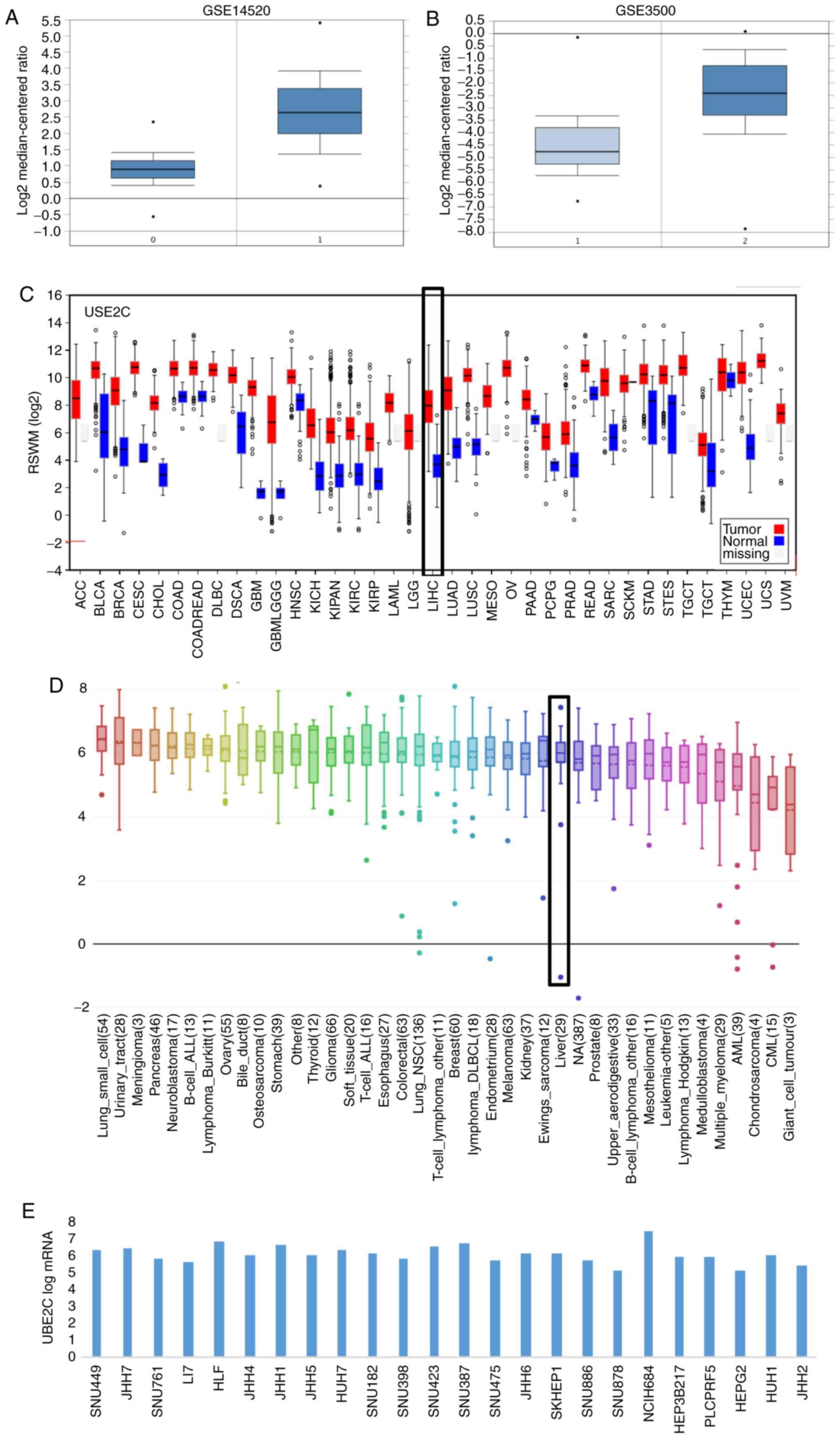 The overall survival of patients with HCC is markedly short, and morbidity is increasing in developed and developing contries. In USA, 22,000 newly diagnosed cases occurred annually, and 18,000 patients succumbed to HCC (4). Approximately 1,000,000 patients in the world are diagnosed with HCC each year (17). Numerous studies and clinical trails had attempted to uncover the molecular mechanisms of HCC (18–20). The present study integrated and thoroughly re-analyzed three datasets of HCC. UBE2C and four other overexpressed DEGs (TOP2A, PTTG1, GPC3 and PRC1) were identified to be associated with HCC. Enrichment analysis revealed that these genes were important for HCC development via different signaling pahtways. Expression validation analysis using GEO and TCGA data demonstrated that these genes were associated with HCC pathogenesis, and survival analysis revaled that the overexpression of these five genes, particularly UBE2C, was important for survival of patients with HCC.