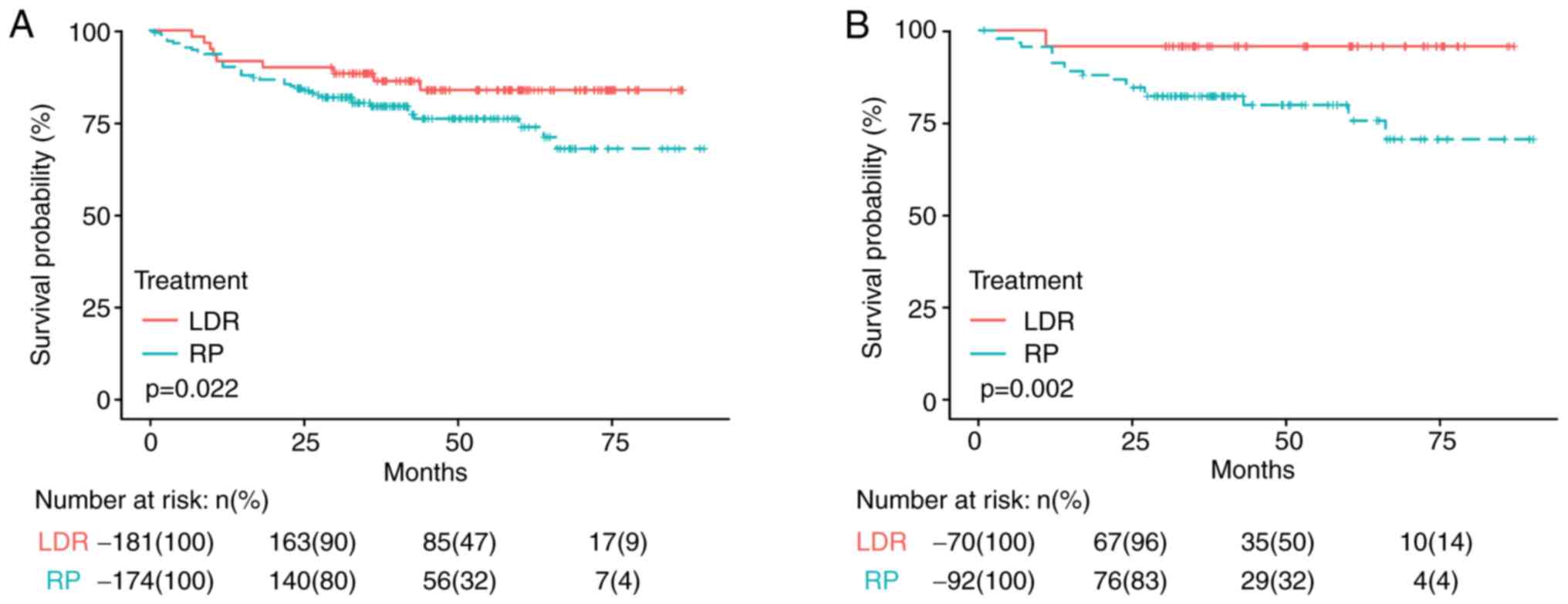 Primary endpoints to determine efficacy were bRFS, clinical relapse-free survival time (cRFS), and Pca-specific mortality time (PCSM). bF was defined as a PSA value of ≥0.2 ng/ml for patients who underwent RP (15) and an increase of 2 ng/ml or >nadir PSA value (16) for patients receiving LDR. If a patient received salvage radiotherapy or endocrine therapy, the patient was considered as having experienced a bF. cRFS was defined as metastases identified by medical imaging, with or without localizing symptoms, or as biopsy-proven local recurrence. PCSM was defined as mortality due to Pca, as noted on the death certificate alongside the biochemical and clinical information, or the presence of uncontrolled metastatic disease at the time the patient succumbed.