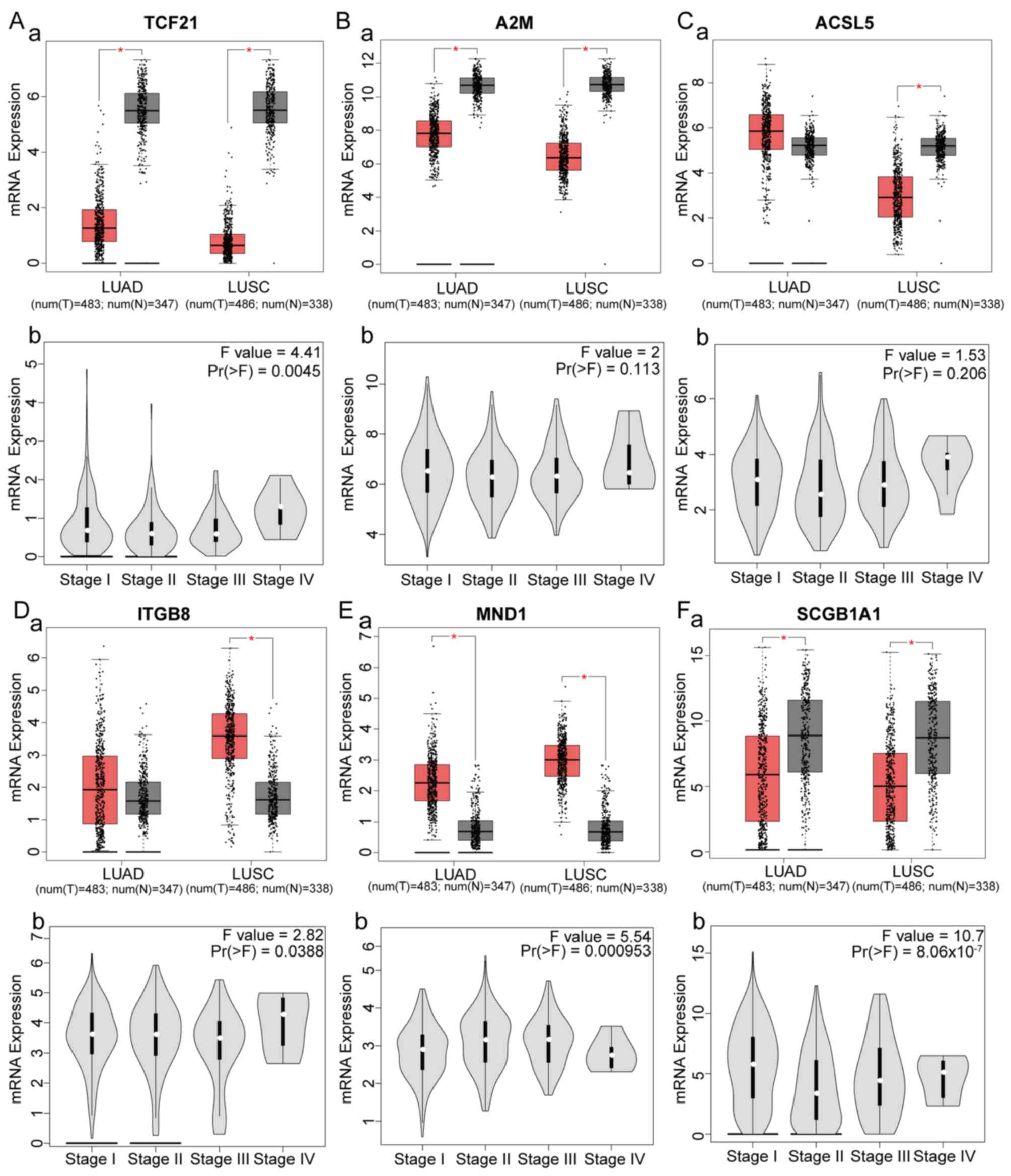 TCF21, located on chromosome 6q23-q24, encodes a basic helix-loop-helix transcription factor essential for epithelial cell differentiation (56,57). It can be readily methylated and subsequently cause tumorigenesis (58,59). A previous study has indicated that hypermethylation and decreased expression of TCF21 are tumor-specific and are frequently observed in NSCLC (60). The protein encoded by A2M is a protease inhibitor and cytokine transporter (61). A previous study has revealed that a progressive A2M deficiency may promote tumor development in nude mice (62). A2M regulated tumor cell adhesion, migration and growth by inhibiting tumor-promoting signaling pathways, including the phosphoinositide 3-kinase/protein kinase B (PI3K/AKT) pathway and mothers against decapentaplegic homolog (SMAD) and upregulating phosphatase and tensin homolog via downregulation of microRNA-21 in vitro and in tumor xenografts (62). The level of A2M in human blood decreases with age (63). ACSL5, a mitochondria-localized enzyme that catalyzes the synthesis of long-chain fatty acid thioesters, is physiologically involved in the induction of apoptosis in intestinal cells (64). Studies have revealed that ACSL5 isozymes serve leading roles in the biosynthesis of mitochondrial cardiolipin and may participate in the survival of cancer cells (65–67). ITGB8, a member of the integrin β chain family, is increased in different types of cancer, including breast, lung, throat and stomach cancer (68). High expression of ITGB8 serves an important role in the metastasis of human lung cancer cells. When ITGB8 is silenced, the expression of E-cadherin and cystatin B is increased, whereas the expression of C-X-C motif chemokine ligand CXCL1, CXCL2, CXCL5, matrix metalloproteinase (MMP)-2 and MMP-9 is decreased (69). Furthermore, changes in the cell cycle, the expression of metastasis-associated genes and metastatic potential may be accompanied by decreased tumor cell signal transduction and molecular activity (69,70). The products of the MND1 gene bind to PSMC3 interacting protein to form stable heterodimer complexes that bind to DNA and stimulate the activities of RAD51 recombinase and DNA meiotic recombinase 1, which are required for meiotic recombination (71). MND1 was significantly upregulated in ovarian cancer compared with ovarian tissue samples from healthy controls (72). However, to the best of our knowledge, MND1 upregulation has not been previously reported in human lung cancer.